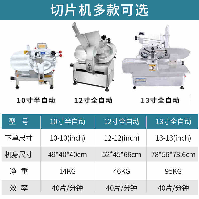 10-inch semi-automatic slicer (manually pushed) 12 inch fully automatic slicer (★more than 75% user selected) 13 inch fully automatic slicer (double-volume cut) 12-inch-with clutch