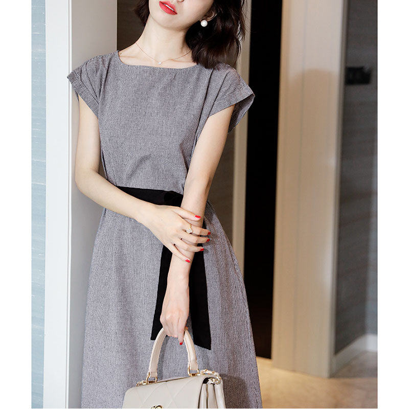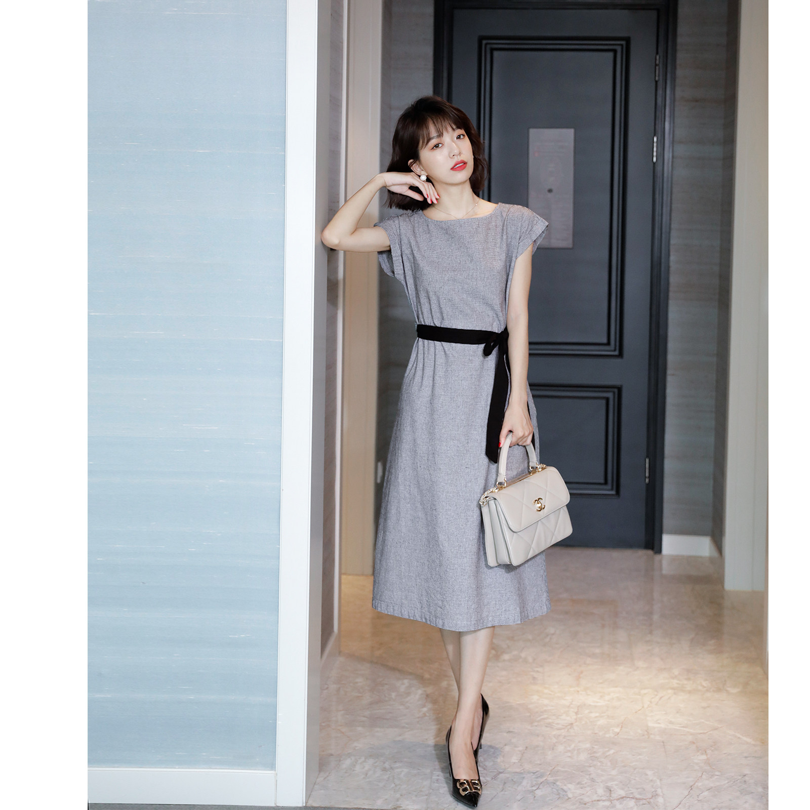 Canary Kiss houndstooth cotton and linen dress women's summer tie-up mid-length linen skirt with slim waist and waist