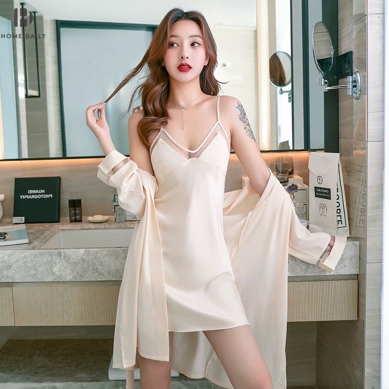 Sexy pajamas with chest pads women's summer thin ice silk hot private room silk suspenders nightdress nightgown two-piece set