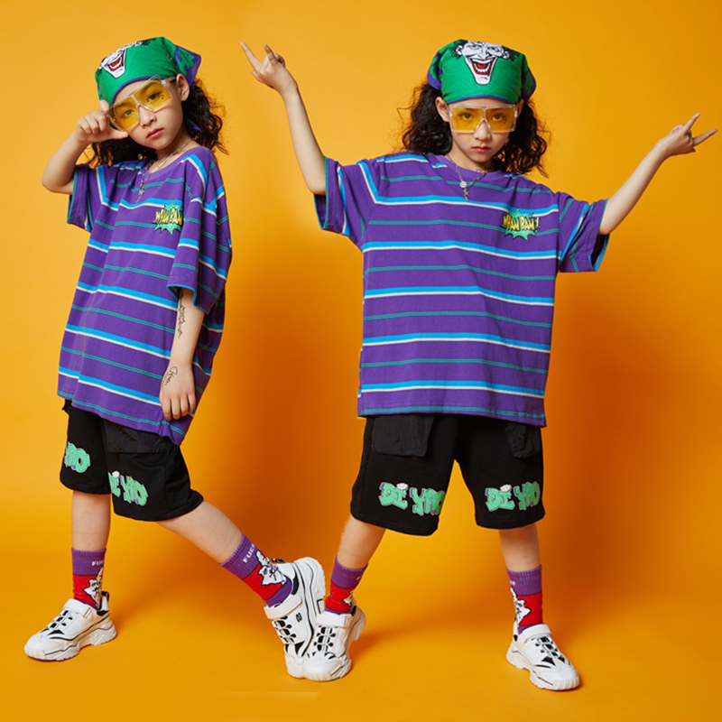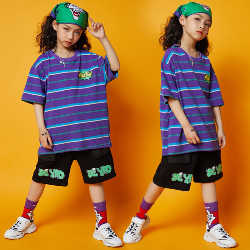 Hip-hop children's hip-hop clothing loose striped T-shirt hiphop performance clothes children's hip-hop suit boys tide