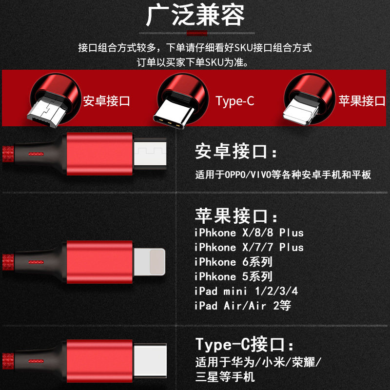 Charging line one drag three quick charging universal bulls 2 m 3m Two-in-one, three-in-one four-in-one, multifunction onboard phone data line lengthened durable suit suitable for Apple Android typec