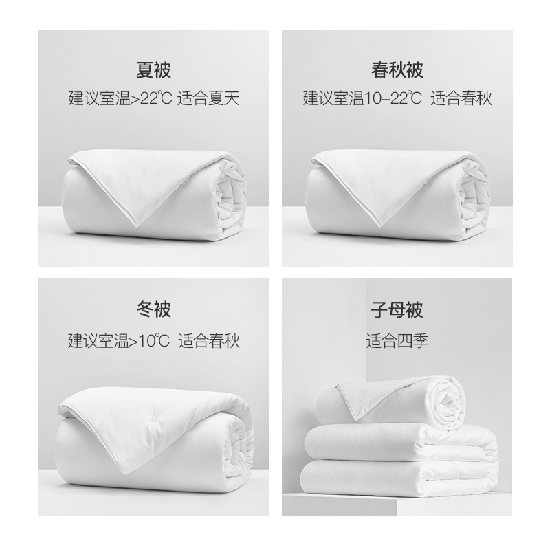 Xia Liang was 150CM*210CM (filled with 0.7 kg, the whole weight was about 2.5 kg, suitable for room temperature above 25 °C) Xia Liang was 200CM*230CM (filled with about 3.5 kg, the whole weight was about 3.5 kg, suitable for room temperature above 25 °C) Xia Liang was 220CM*240CM (filled with 1 kg, the whole weight was about 3.9 kg, suitable for room temperature above 25 °C) The spring and autumn was 150CM*210CM (filled with 1.4 kg The whole weight was about 3.3 kg Suitable for room temperature 10-25 °C) The spring and autumn was 200CM*230CM ( Fill 2 kg The whole weight is about 4.6 kg Suitable for room temperature 10-25 °C) Spring and autumn is 220CM *240 CM (filled 2 kg The whole weight is about 4.9 kg Suitable room temperature 10-25 °C) Winter is 150CM*210CM (filling 2.8 kg The whole weight is about 4.8 kg Suitable for room temperature below 10 °C) Winter quilt 200CM*230CM (filling 4 kg The whole weight is about 6.8 kg Suitable for room temperature below 10 °C) Winter quilt 220CM*240CM (filling 4.8 kg The whole weight is about 7.9 kg Suitable room temperature below 10 °C) The child and mother are 200CM*230CM (filling 1 kg + 3 kg The whole weight is about 9.4 kg Applicable in all seasons) The child and mother are 220 CM *240 CM (filled 1 kg + 3 kg The whole weight is about 10.1 kg Applicable in all seasons)
