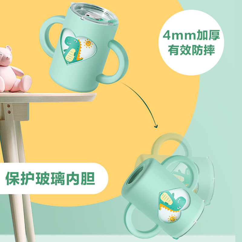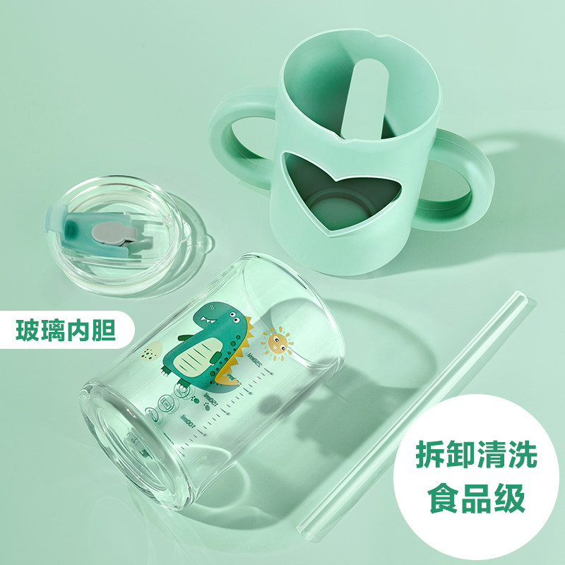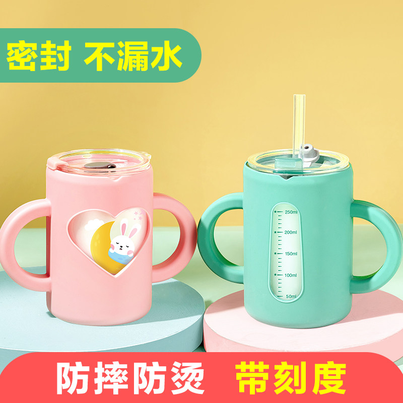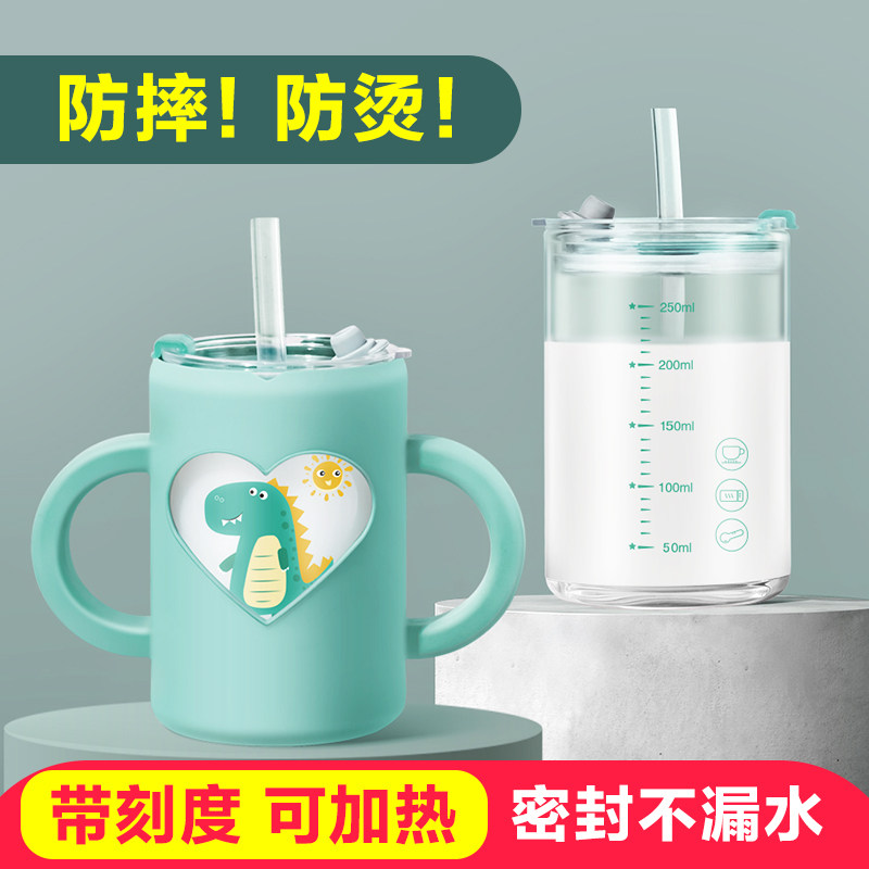 Children's milk cup anti-fall double handle with graduated straw brewing drink milk powder microwave oven baby glass water cup