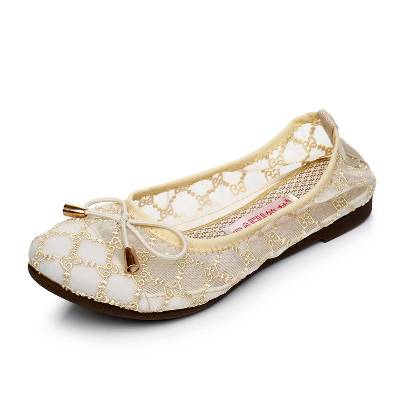 Summer old Beijing cloth shoes women's flat beanie shoes hollow breathable women's mesh shoes bow soft bottom comfortable mother shoes