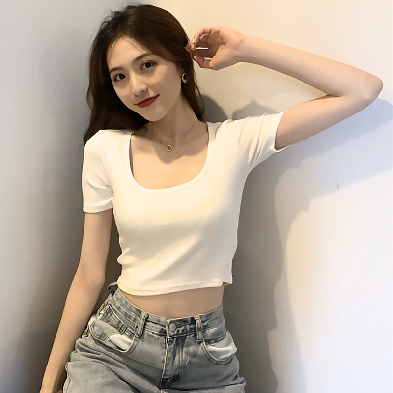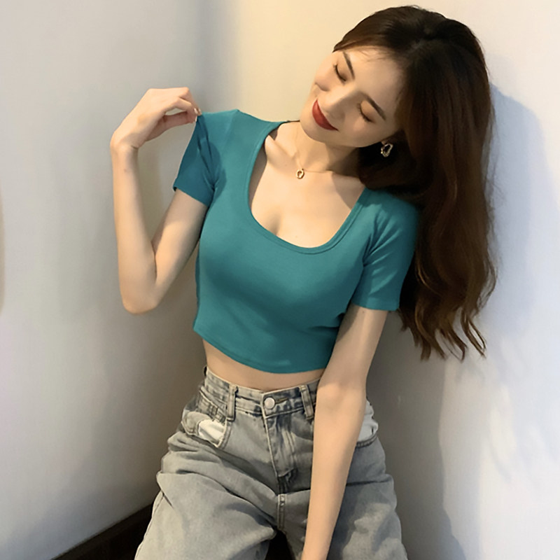 Sexy Pure Desire Black Truffle Short Sleeve T-shirt Woman Summer Hot Girl With High Waist Short And Tight U Collar Bottom Jacket