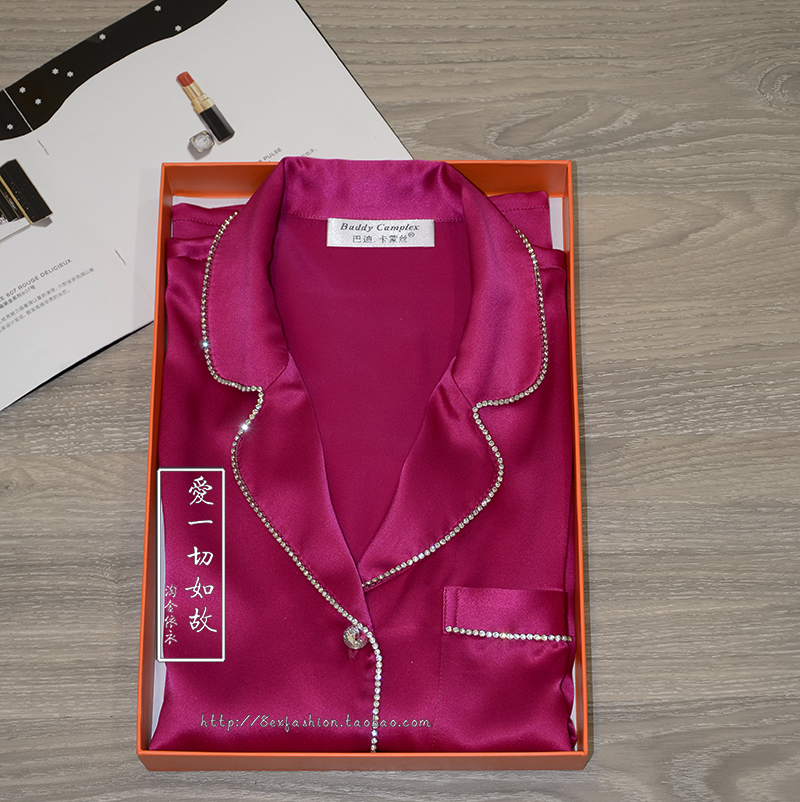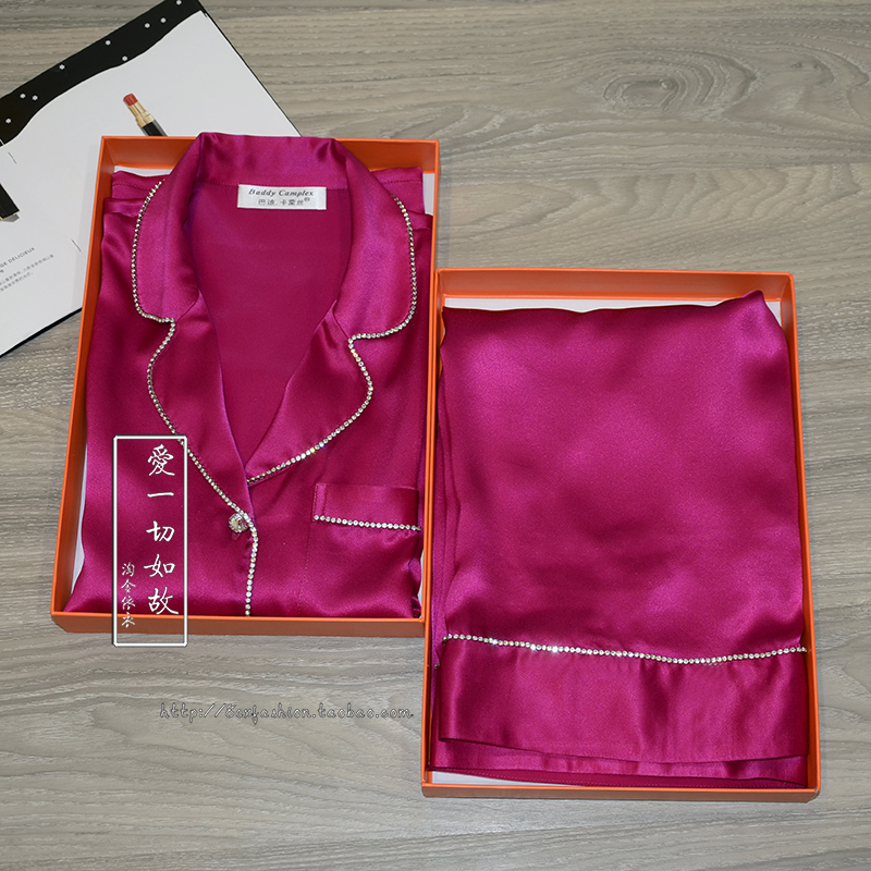 21 new spring and autumn silk 100% silk set pajamas women rose red two-piece home clothing luxury