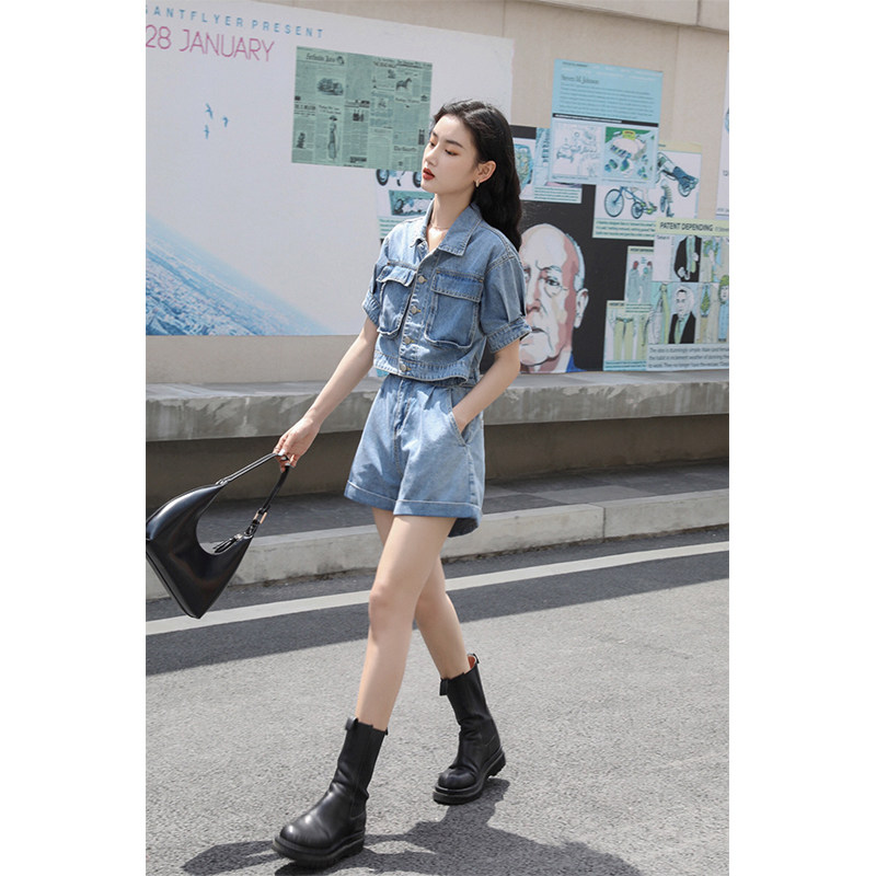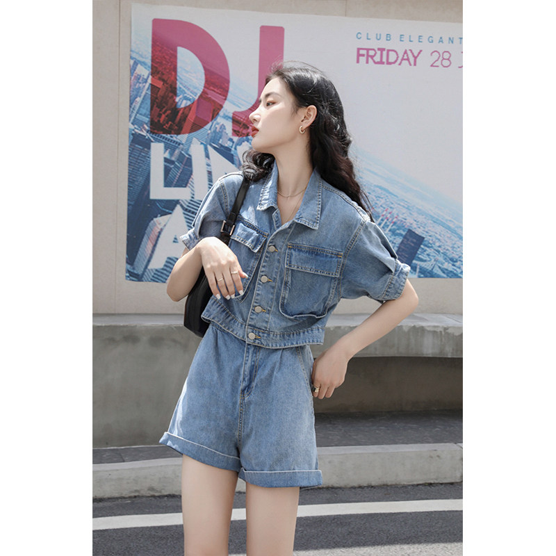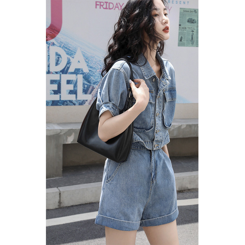 And lane summer short denim suit Women's high waist thin Hong Kong style jumpsuit Frock wide leg shorts jumpsuit