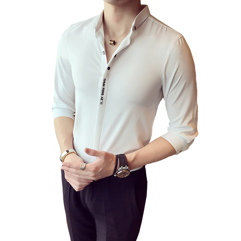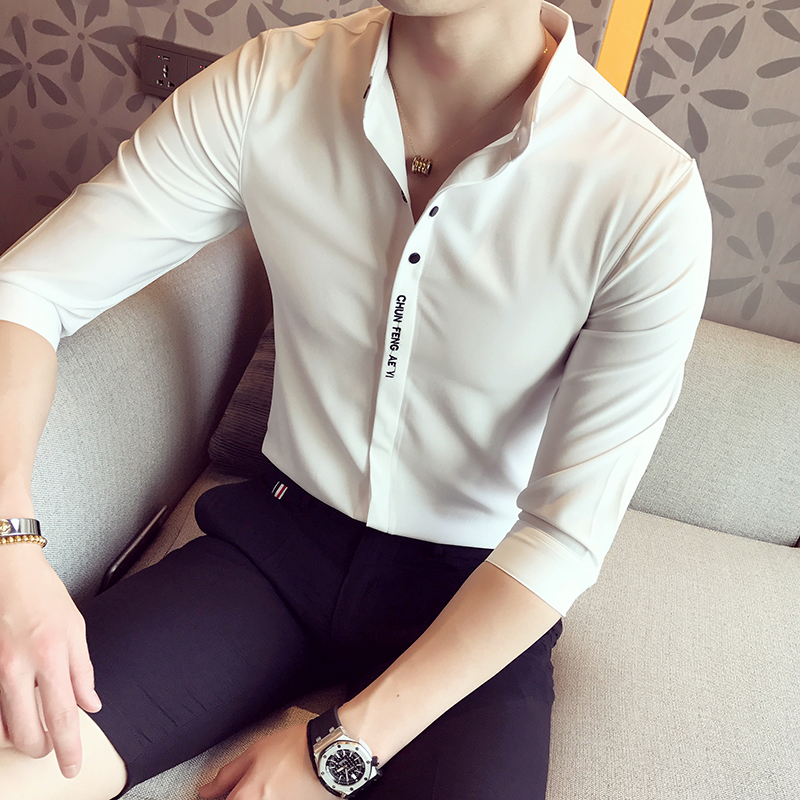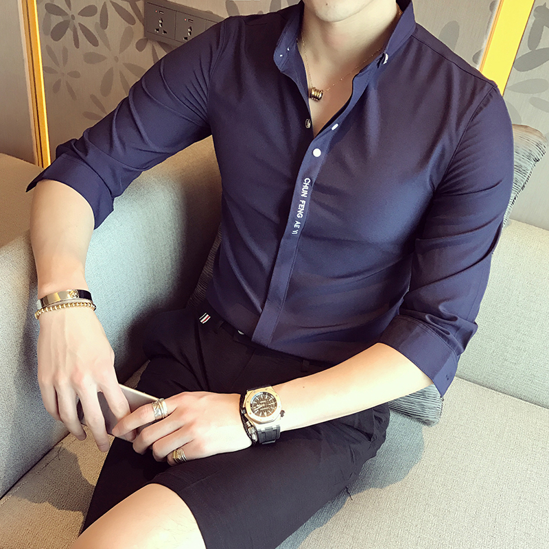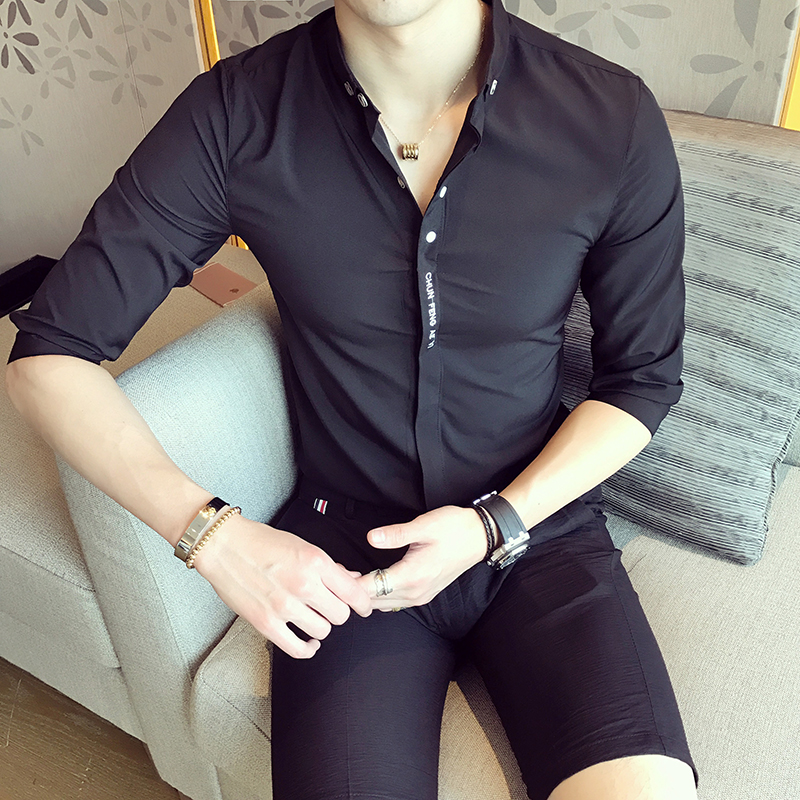Men's three-quarter sleeve shirt summer thin ice silk short-sleeved shirt British style ruffian handsome embroidered inch shirt Korean trend