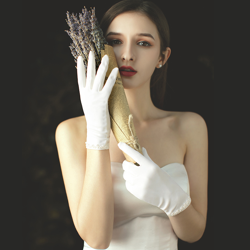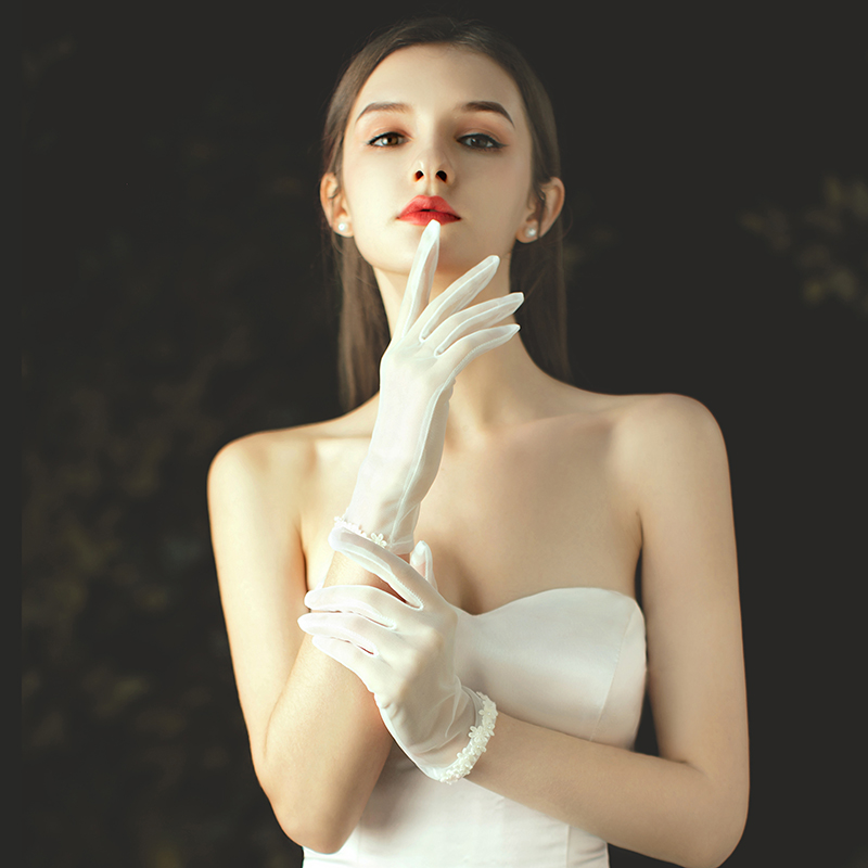 Korean bride pearl short section tulle transparent wedding wedding glove photo studio photo photo glove satin retro female