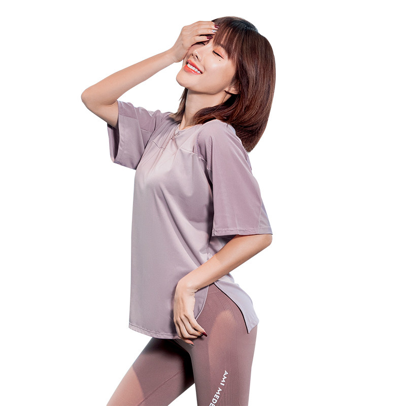 Summer new sport yoga blouses women round collar loose 50% sleeves T-shirt breathable speed dry mesh yarns open fork short sleeves