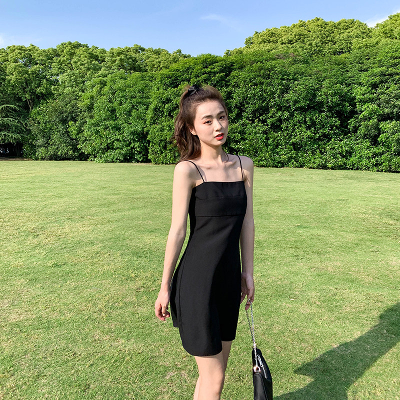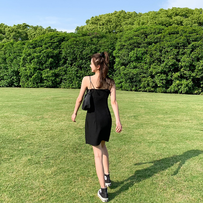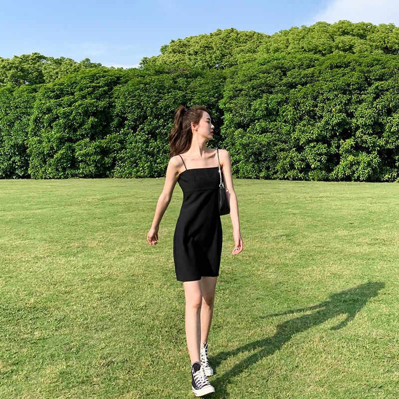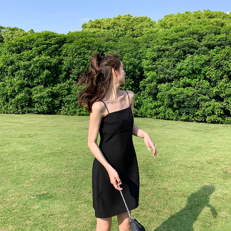 Cold wind black suspender dress female 2022 new summer temperament waist was thin Hepburn scheming little black dress