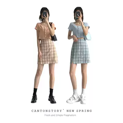 Yangcheng story T-shirt skirt suit women's two-piece summer 2020 new split retro plaid short skirt