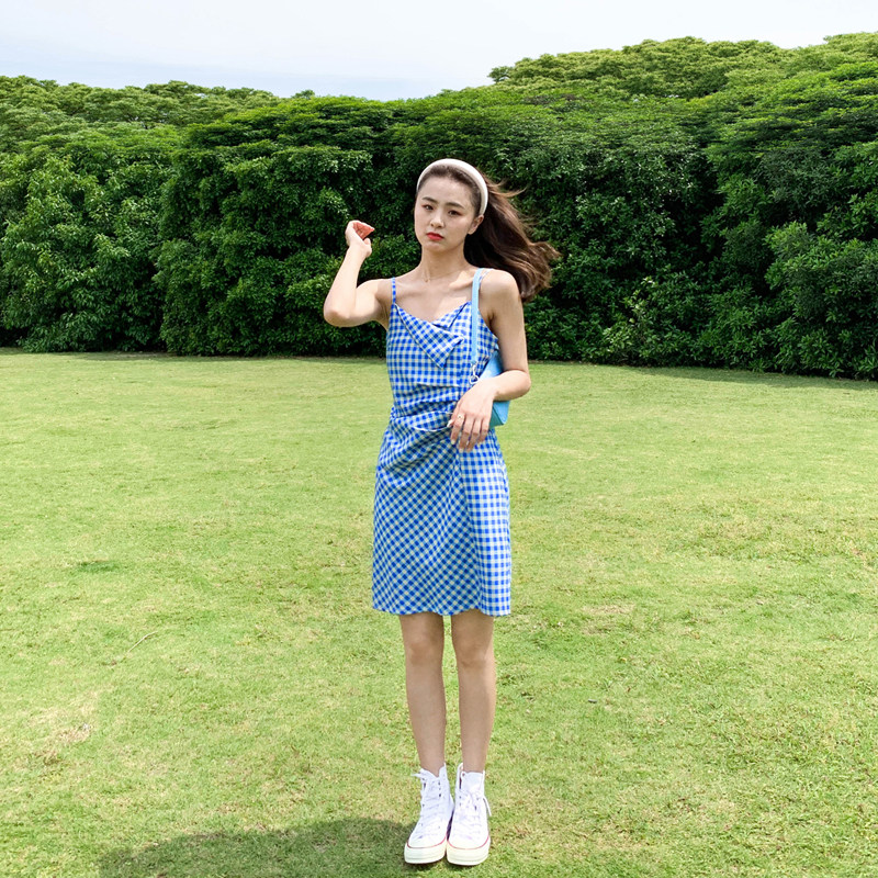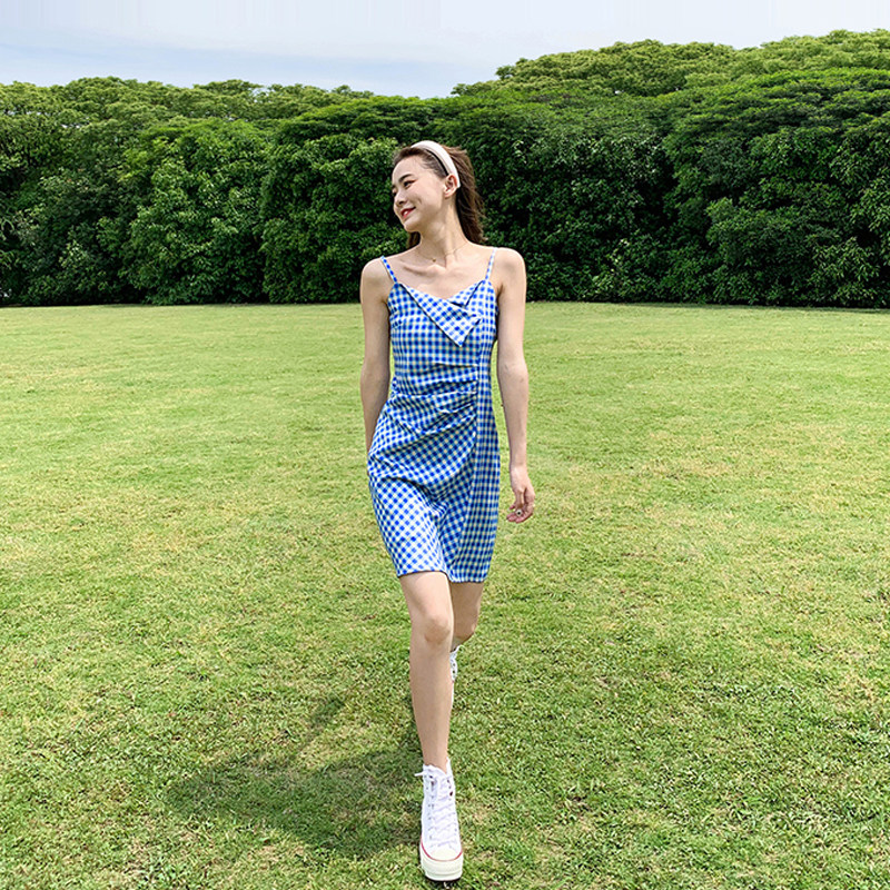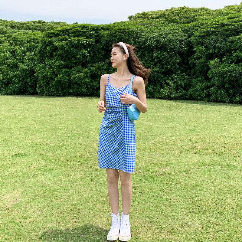 Blue plaid suspender dress female 2022 new summer waist is thin and gentle wind careful machine pleated fairy skirt