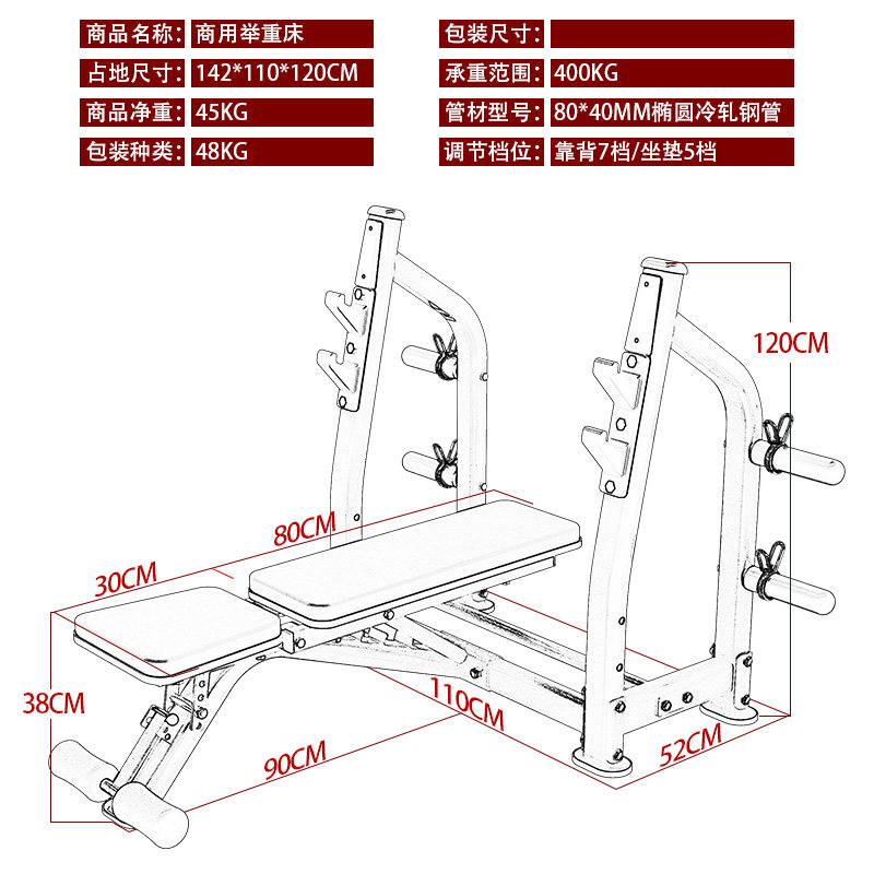 Commercial weightlifting bed (standard version)Lying plate can not be adjusted Commercial weightlifting bed (upgraded version) lying plate cushion can be adjusted standard version 1 8 meters Austrian rod 50KG large hole plastic coated barbell piece
