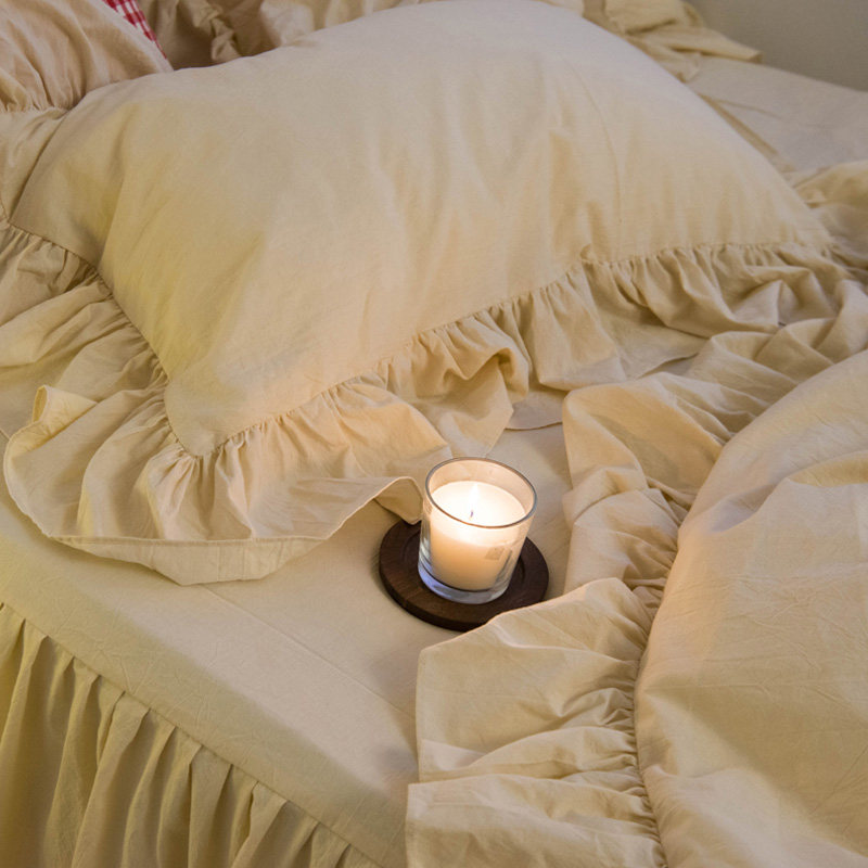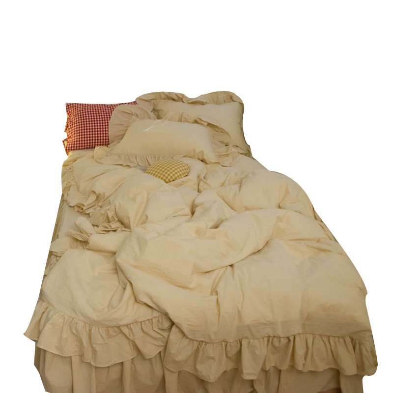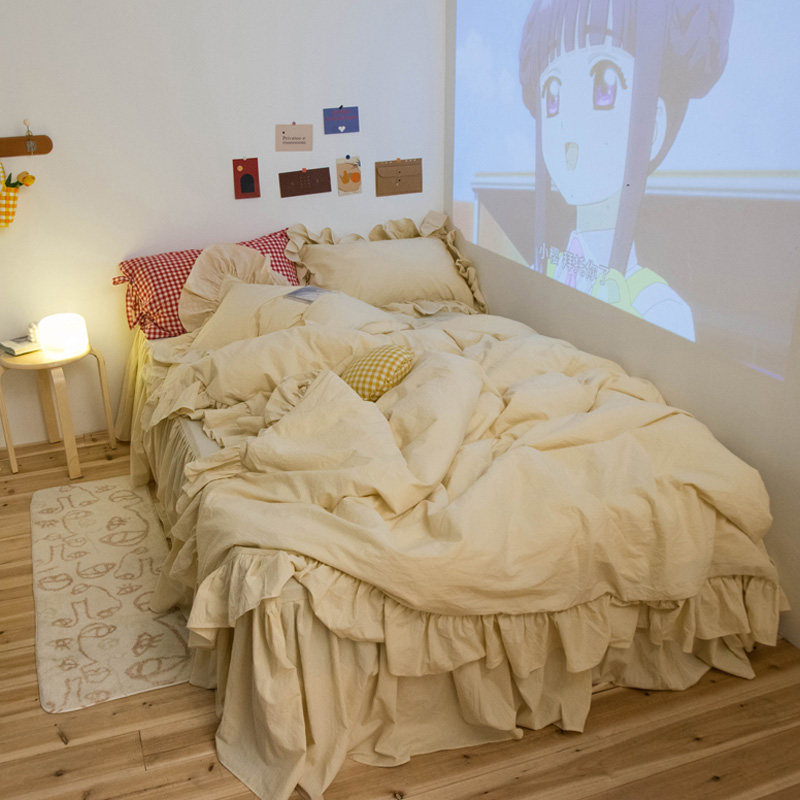 Milk tea cocoa ins wind Korean lotus leaf washed cotton girl heart bed skirt four-piece set of solid color bedding