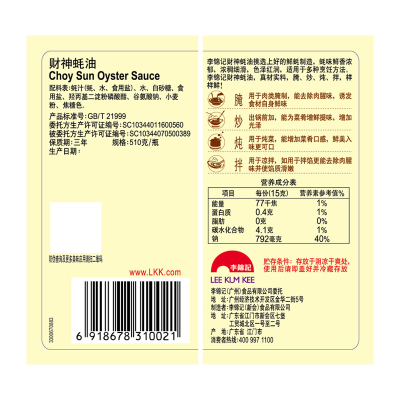 Lee Kum Kee God of Wealth Oyster Sauce 510g*3 Seasoning Stir-fried Vegetables Pickled Hot Pot Cold Vegetable Noodle Sauce