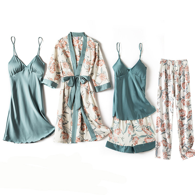 Spring and summer women's sexy thin section ice silk pyjamas five sets long sleeves sleeping robes harness chest cushion sleeping skirt long pants autumn home clothes