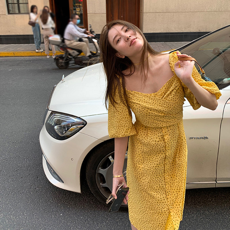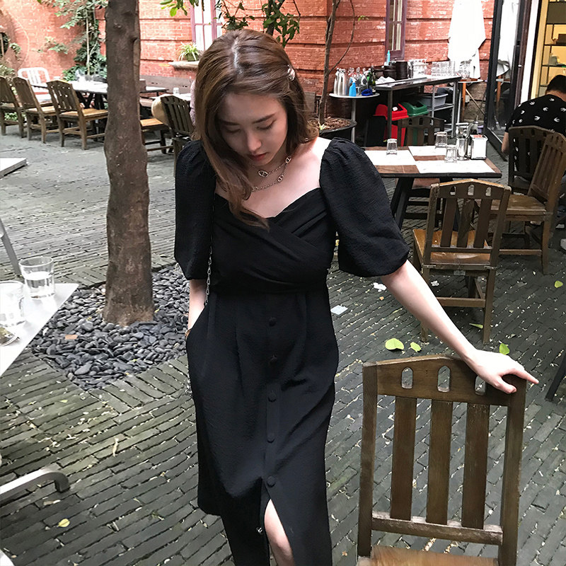 2020 summer new women's dress in large size black medium long version of open fork skirt temperament Fan clothes expats slim fit