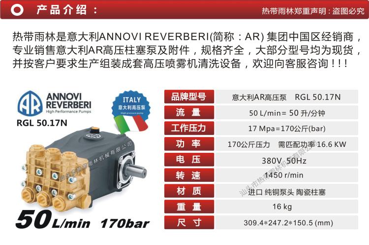 Italy AR high pressure pump RGL50 17N three cylinder piston pump sprayer cleaning machine indenter 50 liters 170 kg