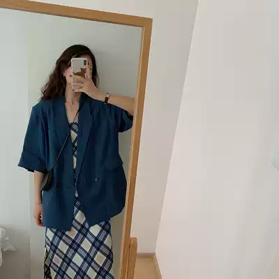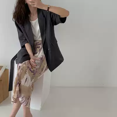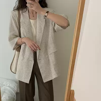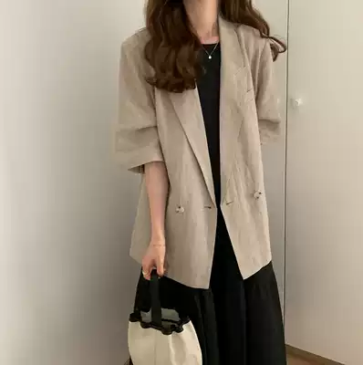 (30% off for a limited time)Linen gun split collar belt double-breasted design loose mid-sleeve suit