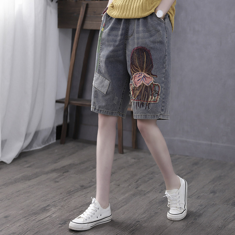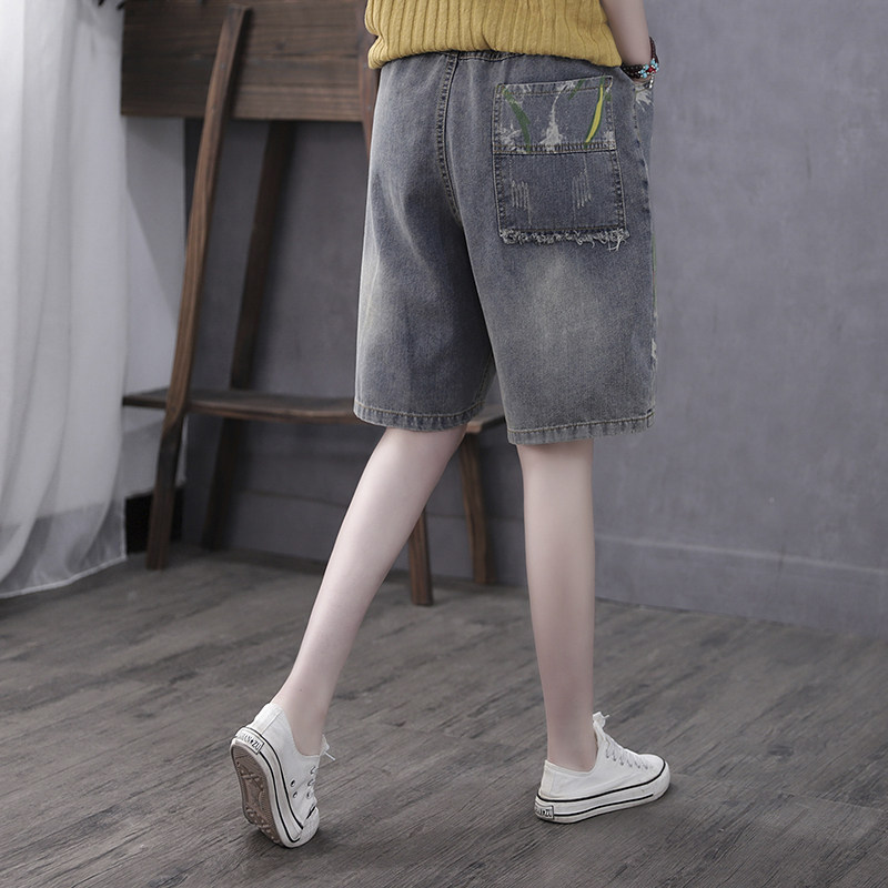 Han Soyi Retro Art Summer New Bugstick Embroidered Jeans 50% Pants Woman Loose Straight Tube Pants Slim 50% Pants