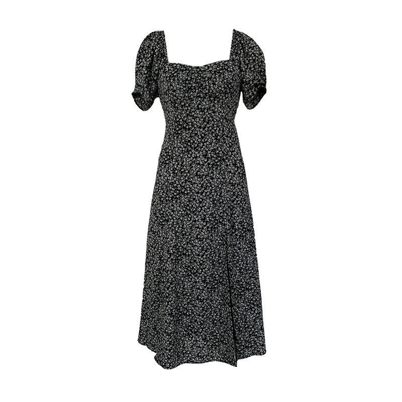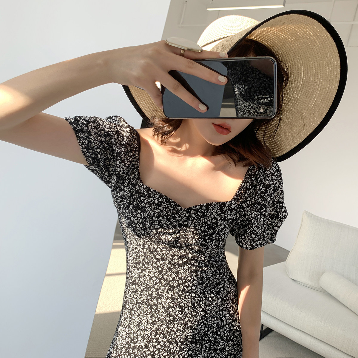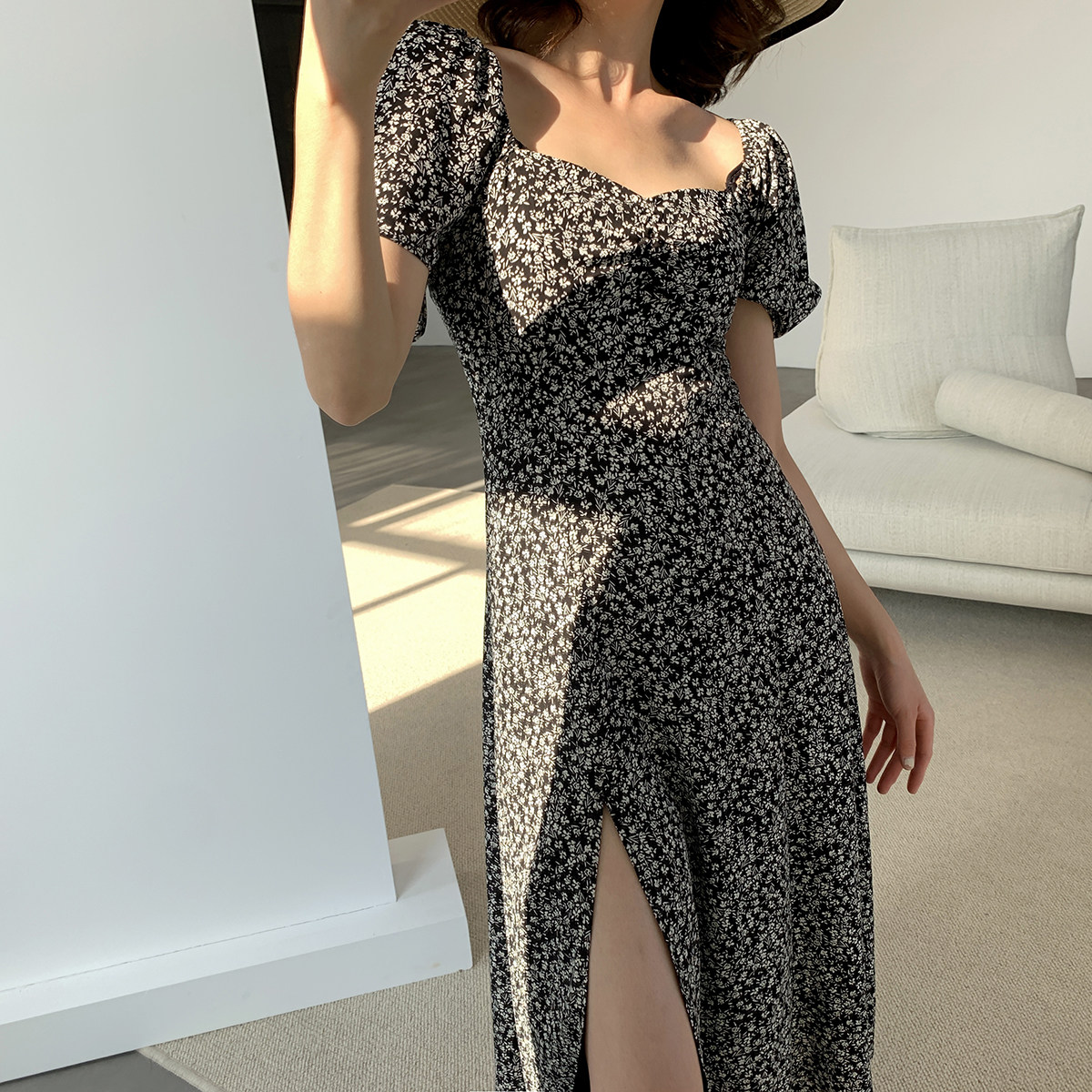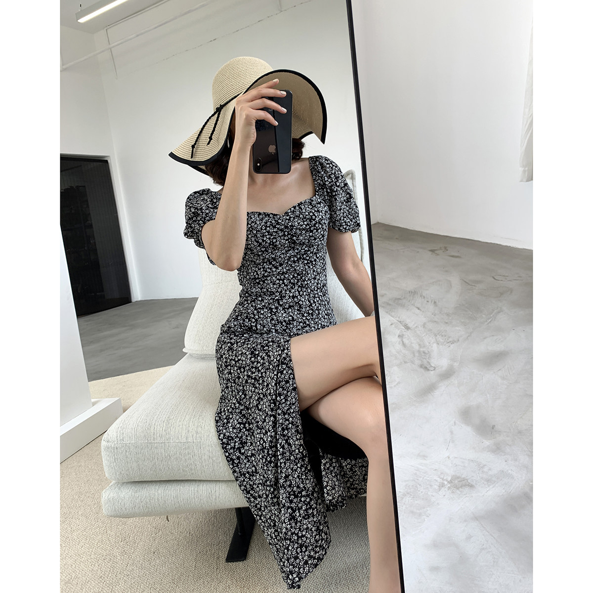 Goo Custom Crumbled Floral Dress Woman 2022 New Summer Dress Square Collar Collection Waist Display Slim Temperament Open Fork Mid-Length Dress