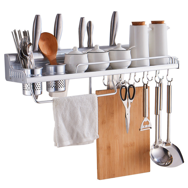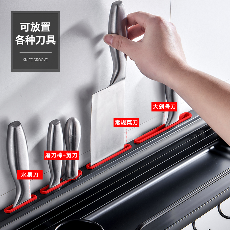 Free hole black kitchen shelf wall-mounted space aluminum knife holder multi-function storage pendant shelf Household Daquan