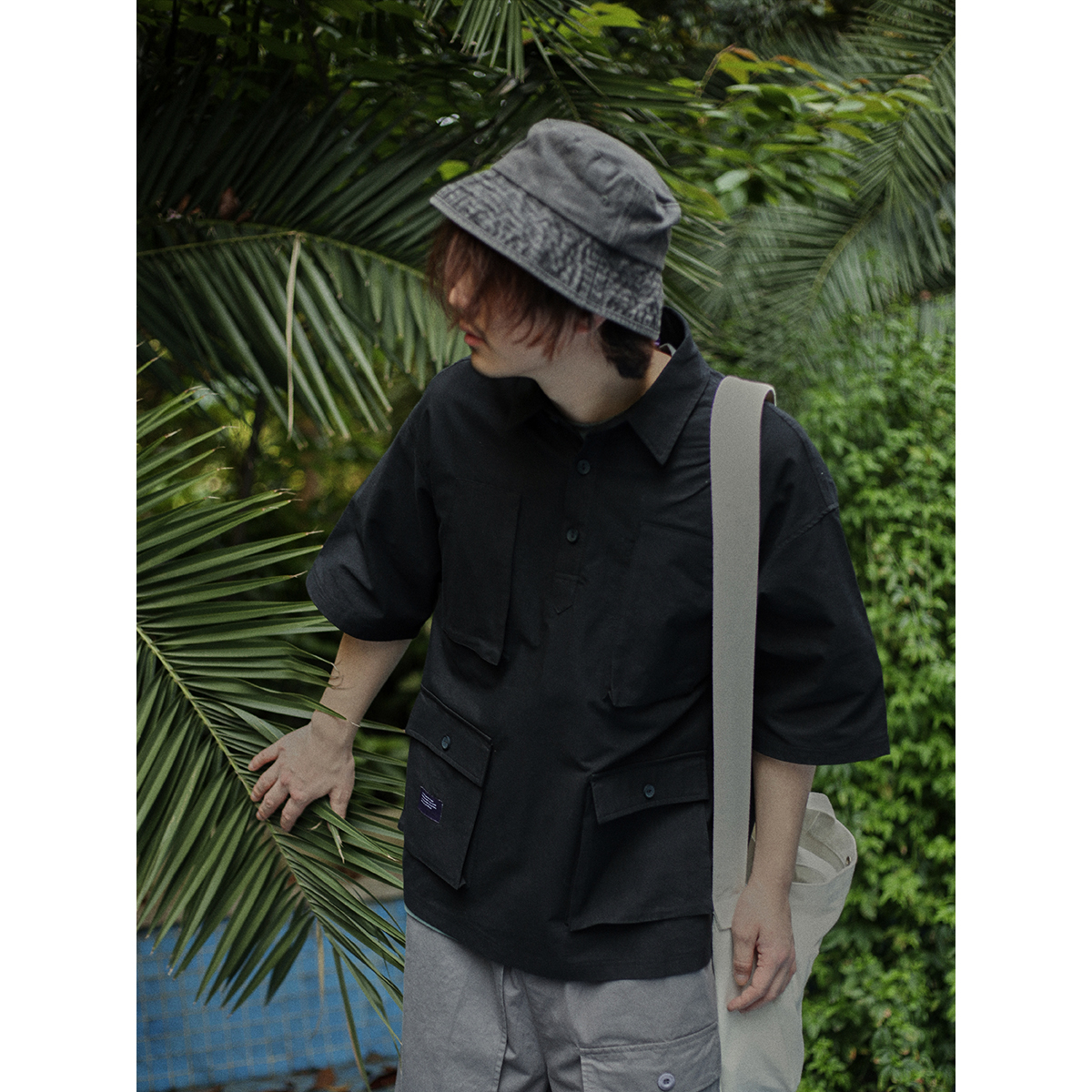 Crisis youth black polo shirt summer men's T-shirt loose Japanese tide brand tide port style tooling short-sleeved shirt