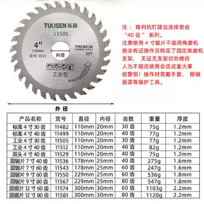 Industrial grade 4 inch(30 teeth)Industrial grade 4 inch (40 teeth)Industrial grade 4 inch double head (40 teeth)Industrial grade 7 inch(60 teeth)Industrial grade 9 inch (80 teeth)Industrial grade 12 inch(8