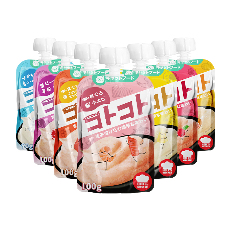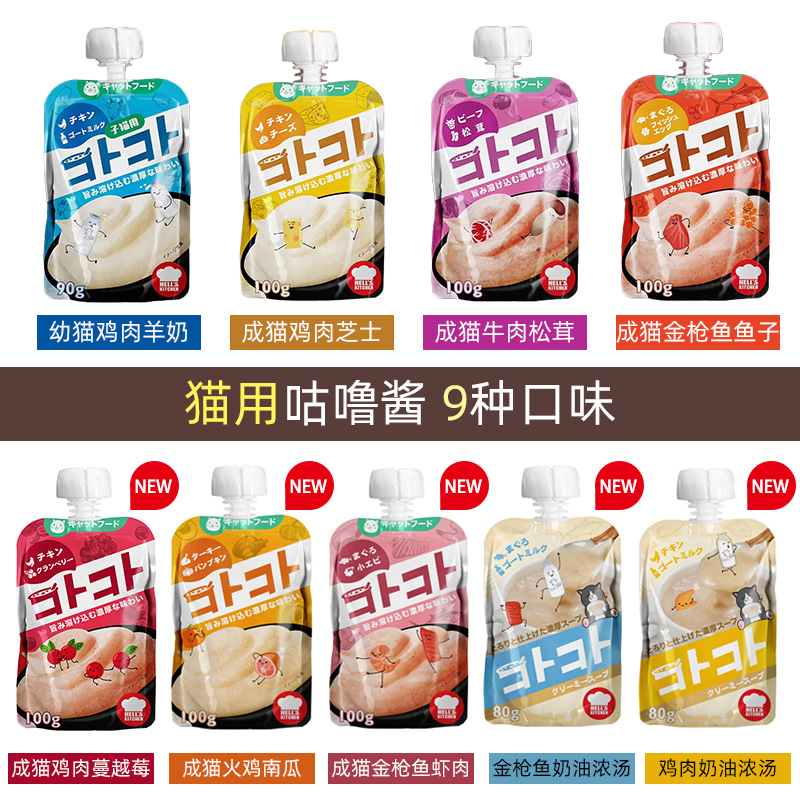 Tuna Fish Fruity Turkey Pumpkin Taste 100g * 6 Packs Young Cat Chicken Goat Milk Taste 90g * 6 packs Chicken Cheese Taste 100g * 6 packs of beef Fruity Notes 100g * 6 Packs Tuna Fresh Shrimp Taste 1