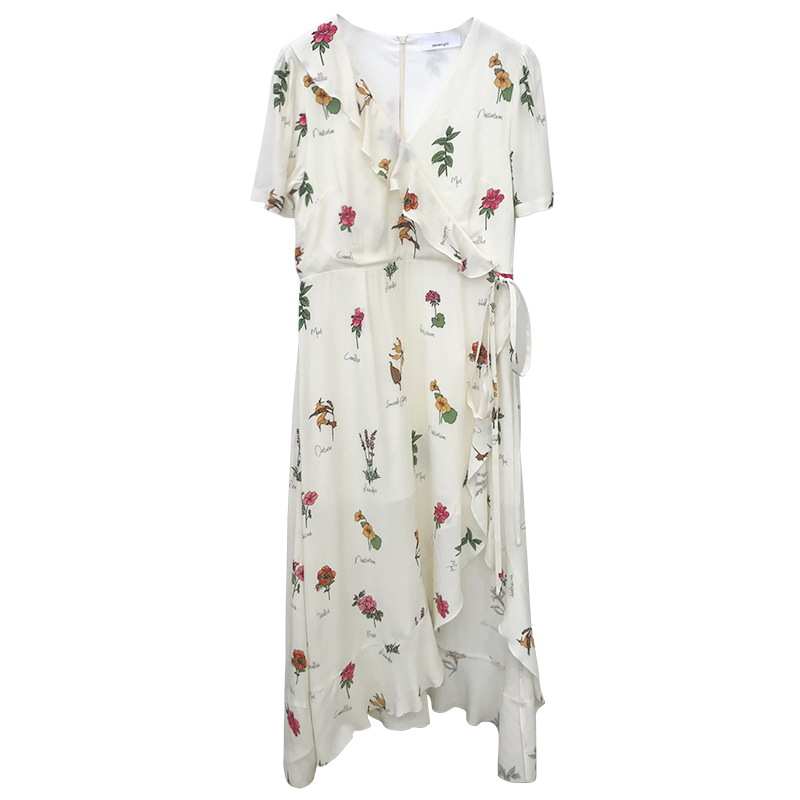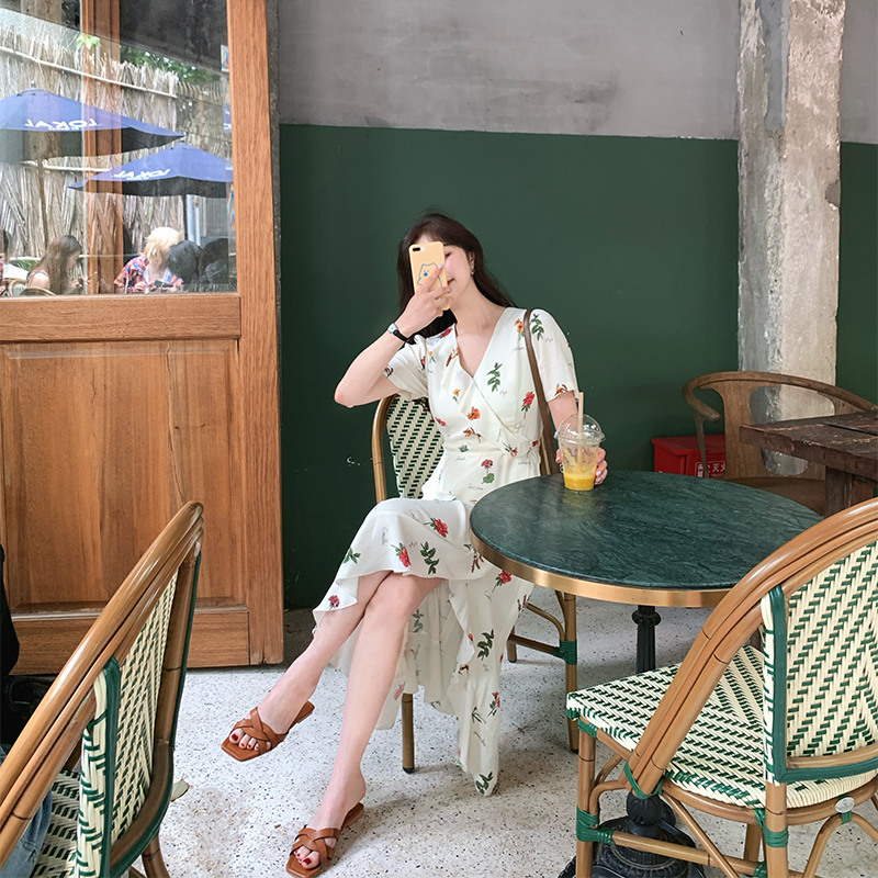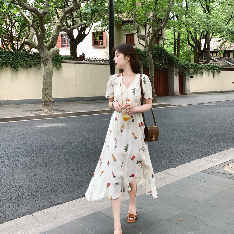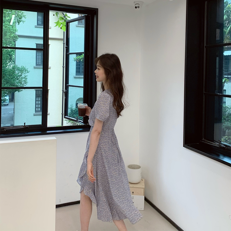 Clearance purple floral dress women's 2020 summer new lace-up waist thin ruffle skirt