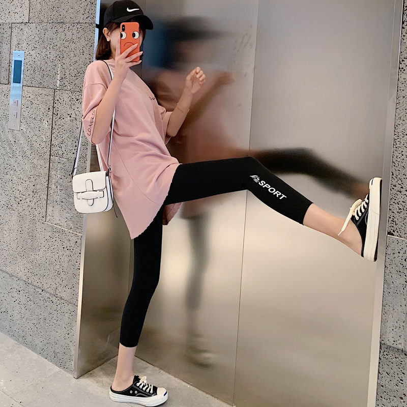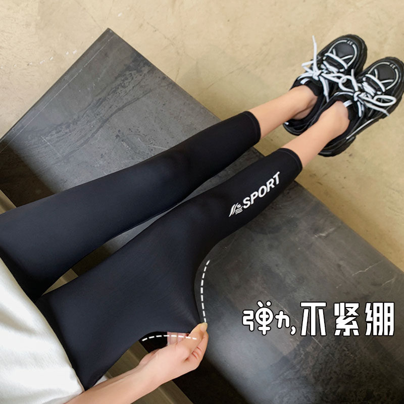 Ice silk thin bottoming pants women wear high waist letters elastic quick-drying nine points sports yoga tight eight points summer
