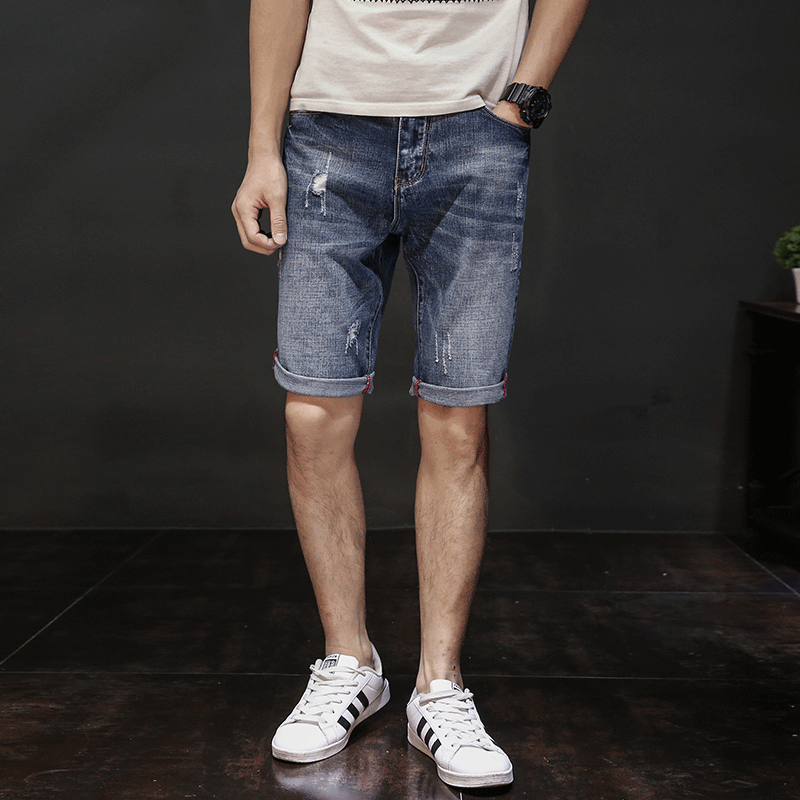 2020 thin Jeans Shorts Male Straight Cylinder Loose Korean version Chaumen 50% pants Broken Jeans 50% Pants Outside