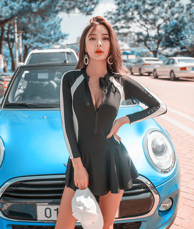 South Korean large size dress style one-piece swimsuit woman covered with slim speed dry diving suit woman long sleeve sunscreen conservative swimsuit woman
