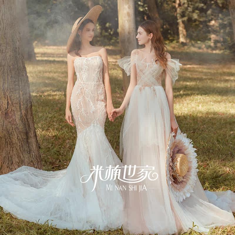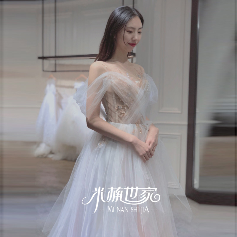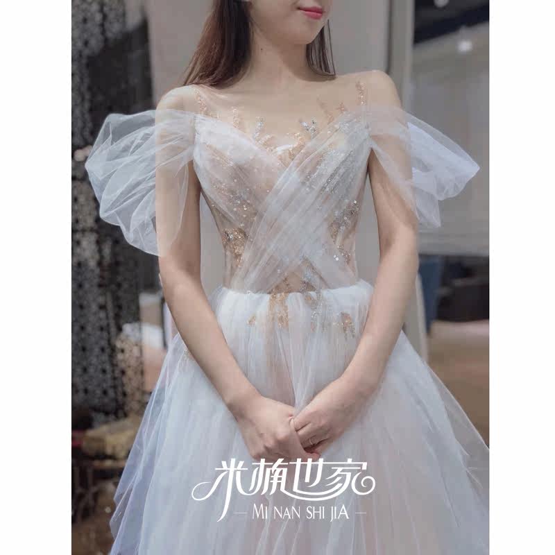 New autumn and summer shoulder wedding dress light forest Super fairy dream dress bubble sleeve French tour Net red lawn