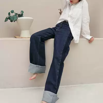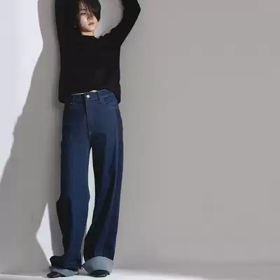 DEARJOANNN JEANS WOMEN'S STRAIGHT LOOSE ROLLED-UP WIDE-LEG PANTS MOPPING THE FLOOR HIGH WAIST THIN DARK BLUE LONG PANTS TIDE