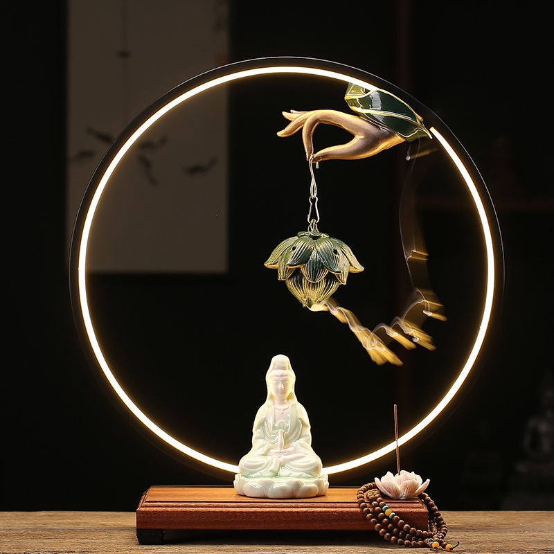Zen meditation-lamp circle backflow incense ornaments (gift backflow incense, pinch flowers and insert Buddha beads) Gong Xi Fa Cai Maitreya-lamp circle backflow incense ornaments (gift backflow incense, pinch flowers and insert Buddha beads) Guanyin-lamp