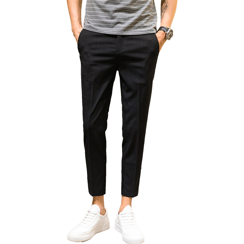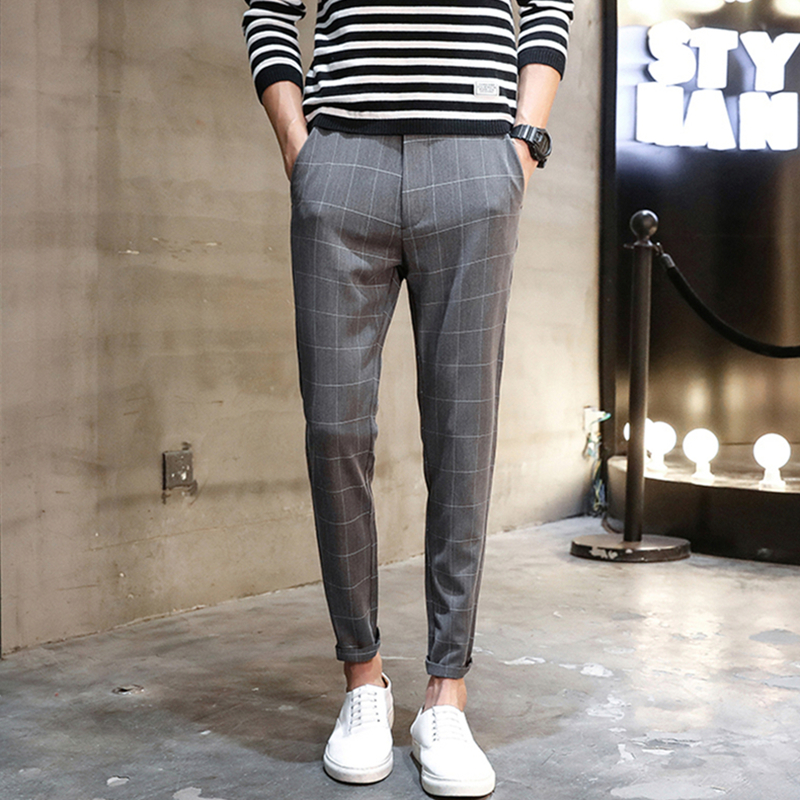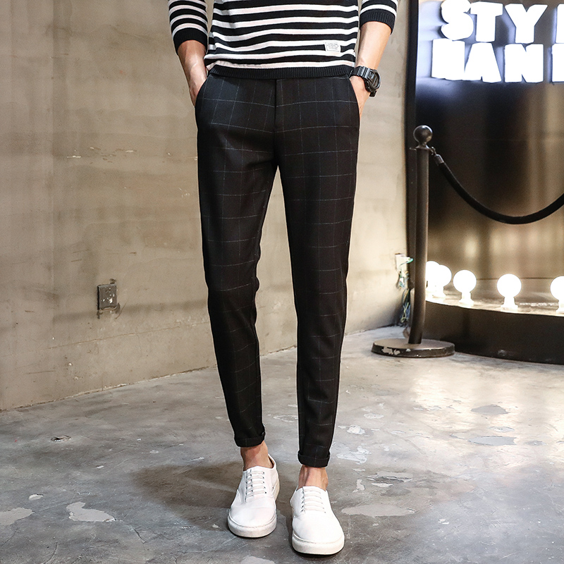 Spring and autumn new casual trousers men's Korean version of the trend slim small feet plaid trousers wild summer men's nine-point pants