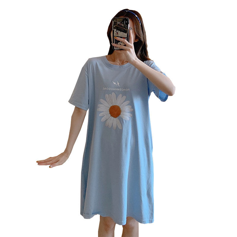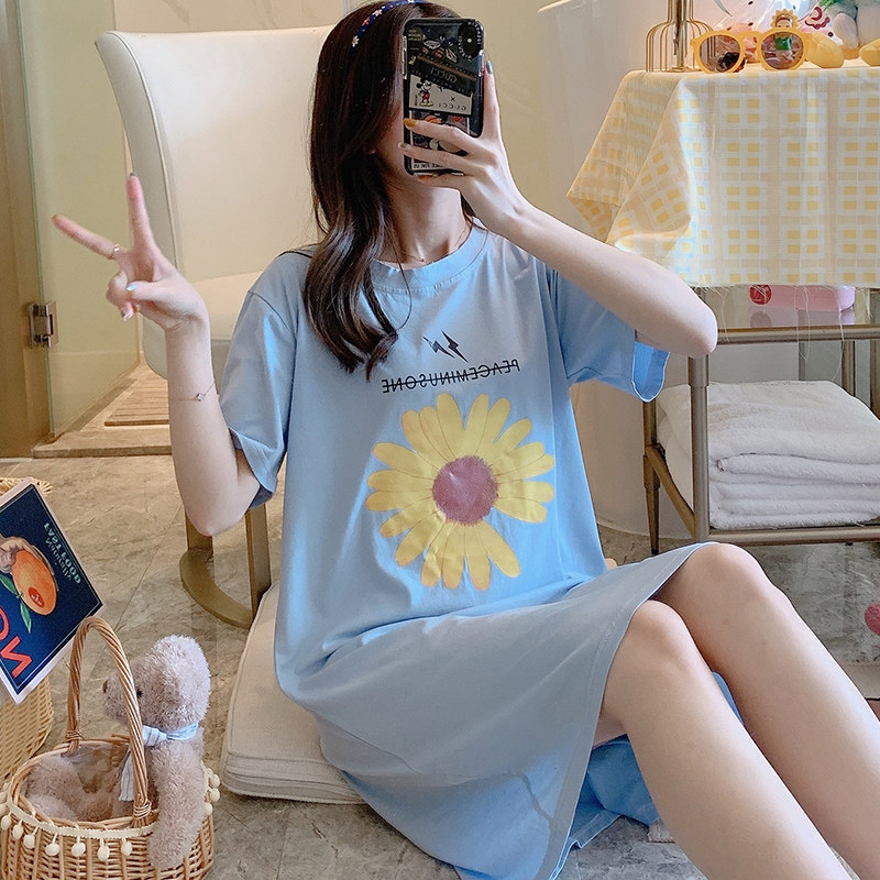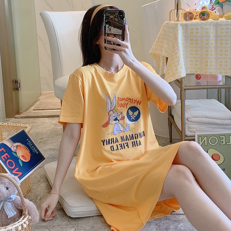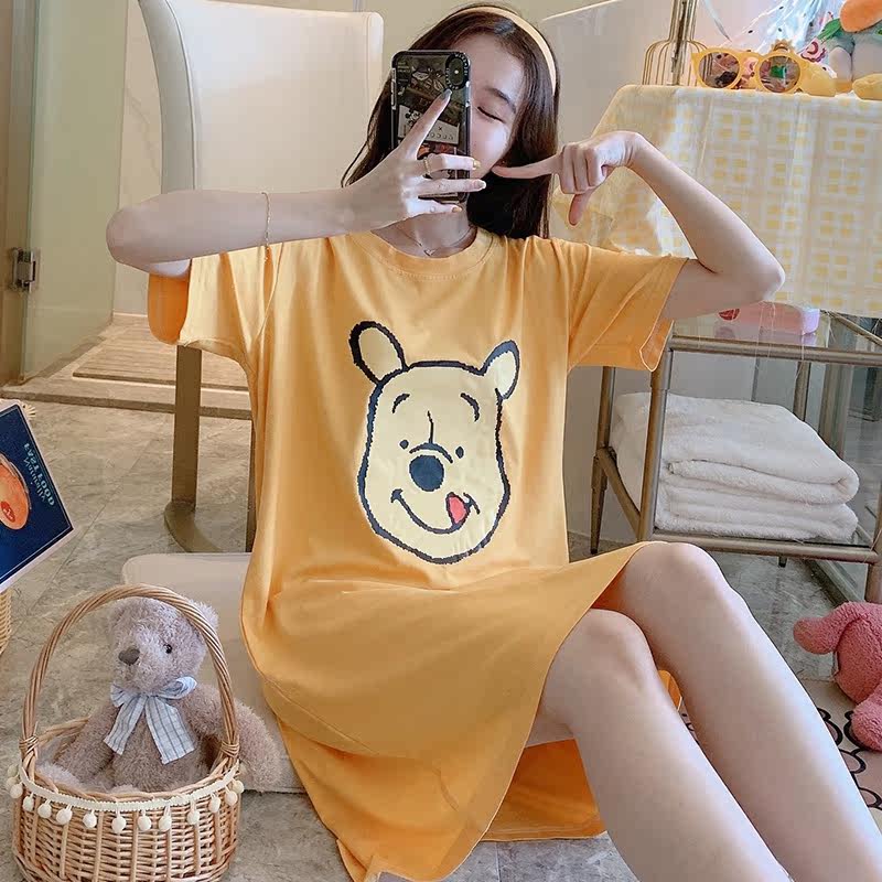 Nightdress women's summer cotton short-sleeved thin section solid color cartoon cute sweet pajamas loose large size student home clothes