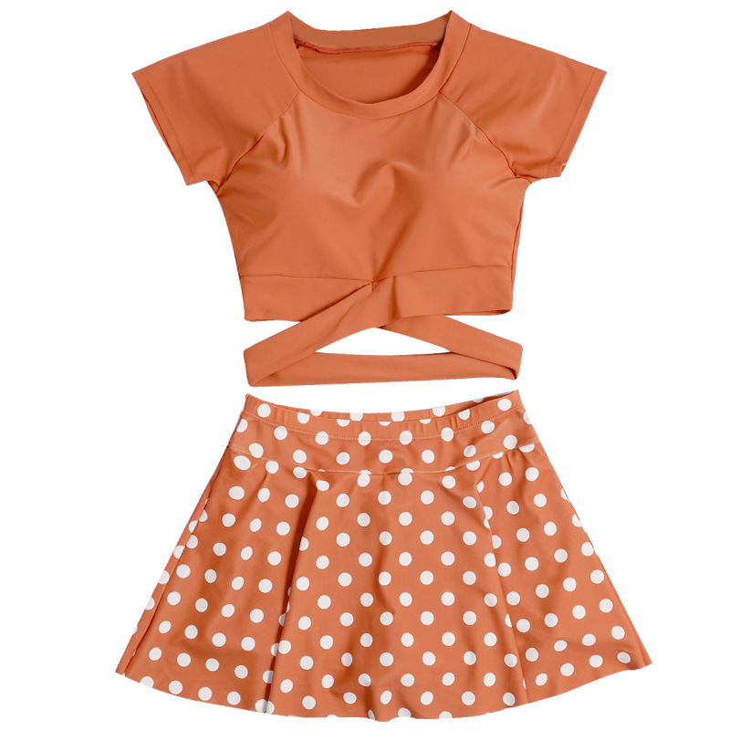 Hot spring swimsuit women's two-piece skirt short-sleeved three-piece suit flat angle conservative sexy wave dot beach vacation swimsuit