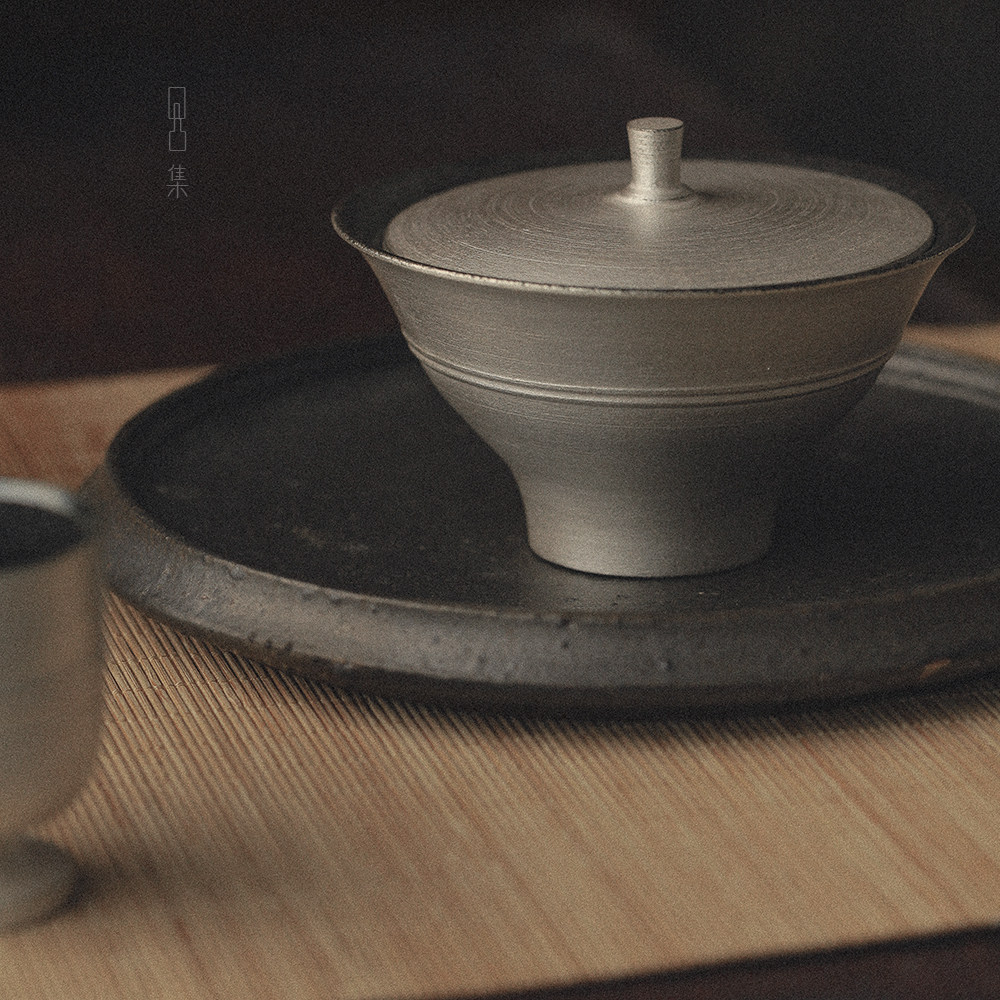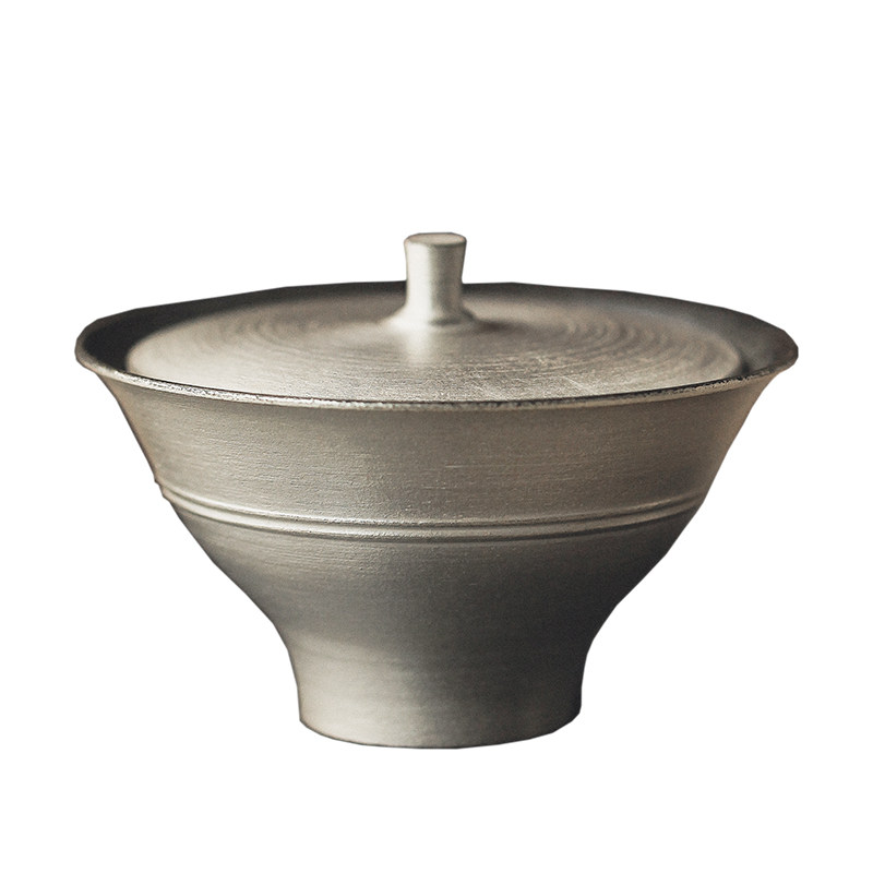 Artist's hand-made Wabi-sabi silver-colored ceramic cover bowl, Japanese-style tea ceremony for one person, retro large bubble bottle, bump set