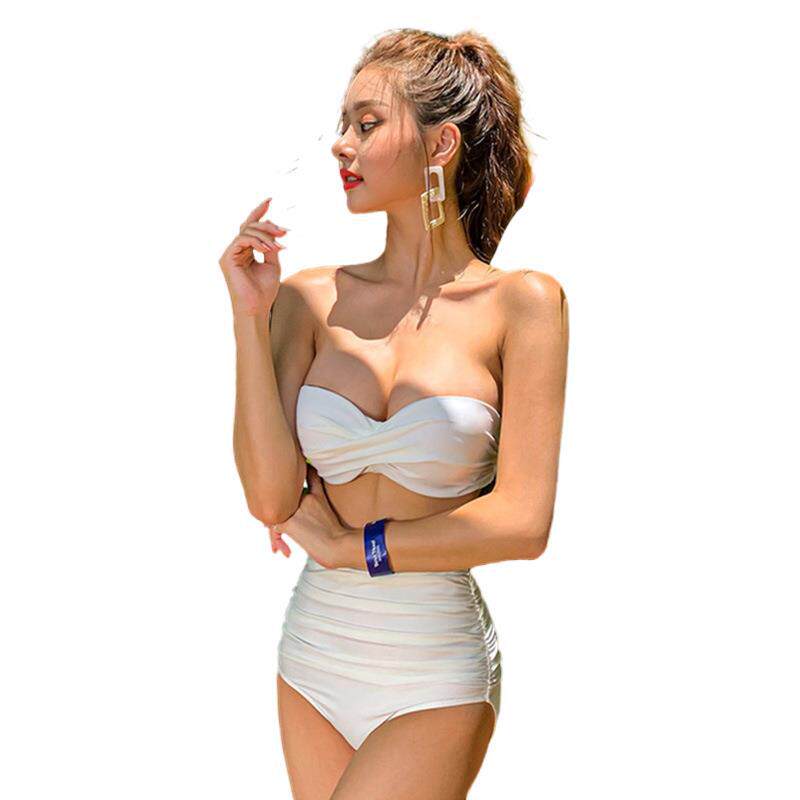 Bikini swimwear women white sexy ins wind strap three-point small chest gathered high waist split with steel ring