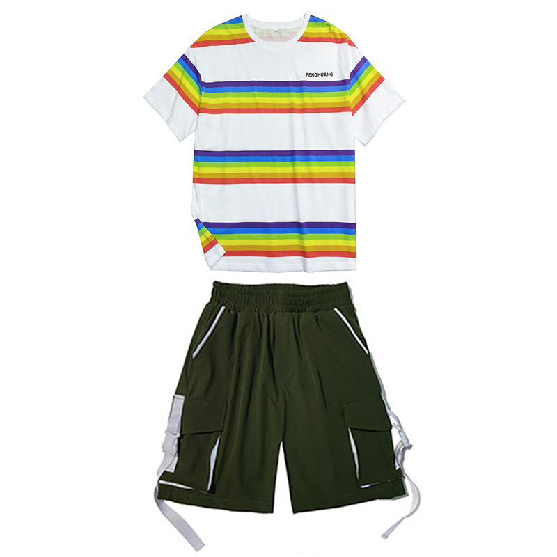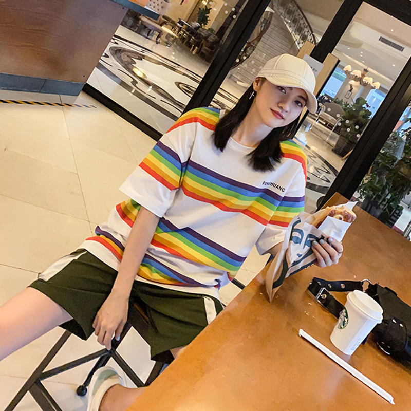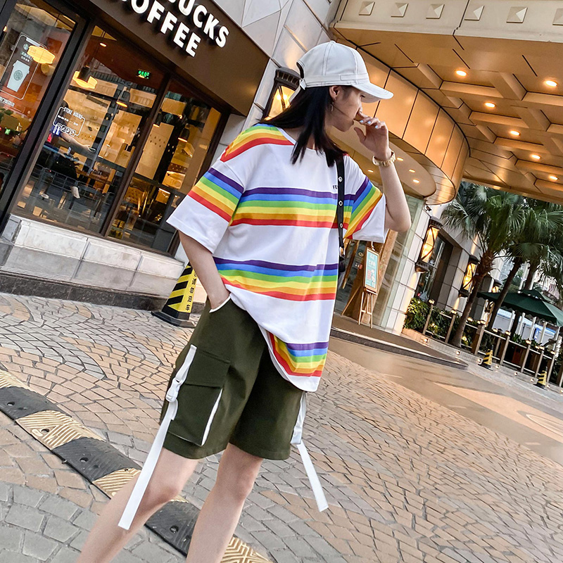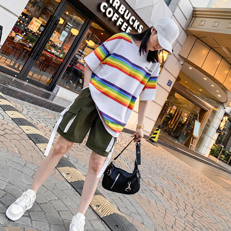 Casual sports suit women's trendy brand fashion summer loose foreign style rainbow short-sleeved overalls shorts hip-hop two-piece suit