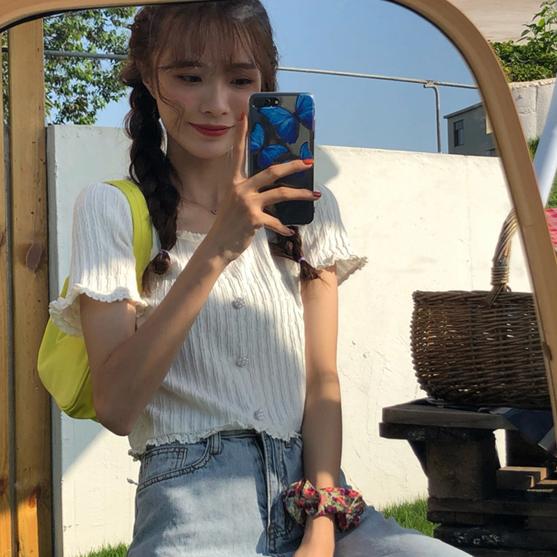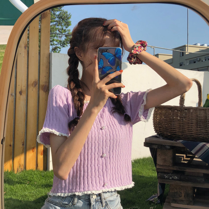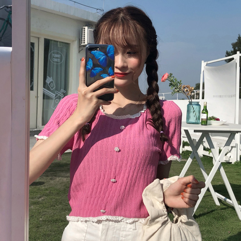 Thin Ice Silk Knit Cardigan Woman collar Short sleeves Positive Shoulder Blouse Lace Side Design Sensation Slim-skinny short T-shirt