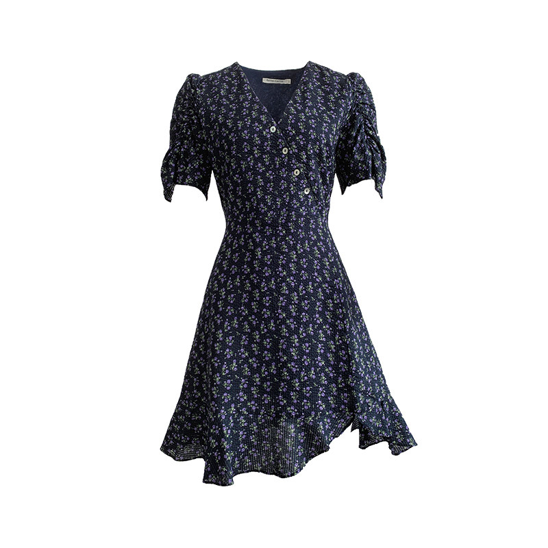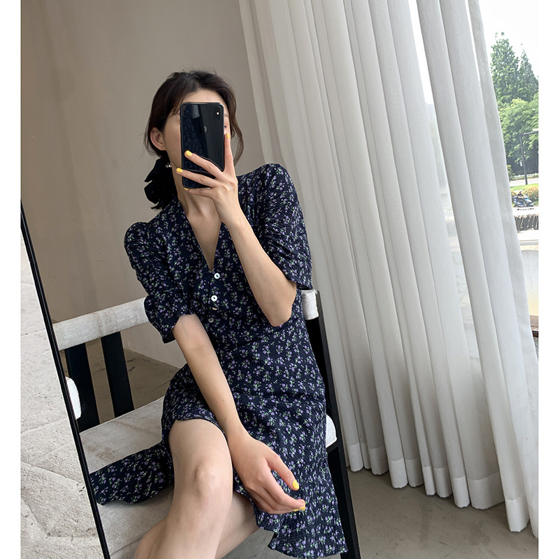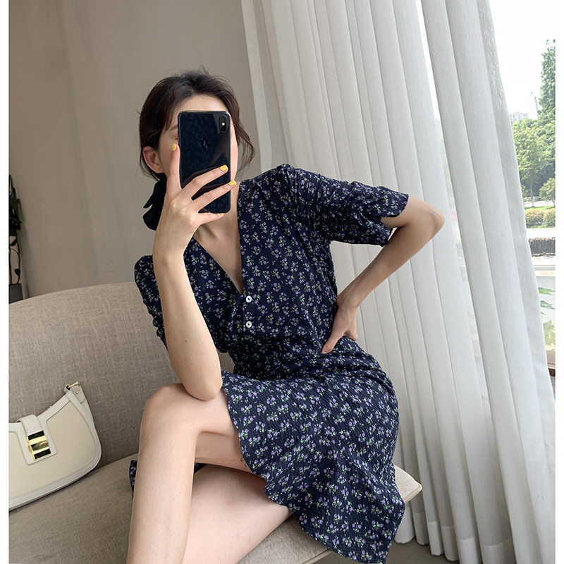 Goo custom blue crushed floral dress woman 2022 new summer fitting V collar collection waist display slim short sleeve foreign pie a word dress