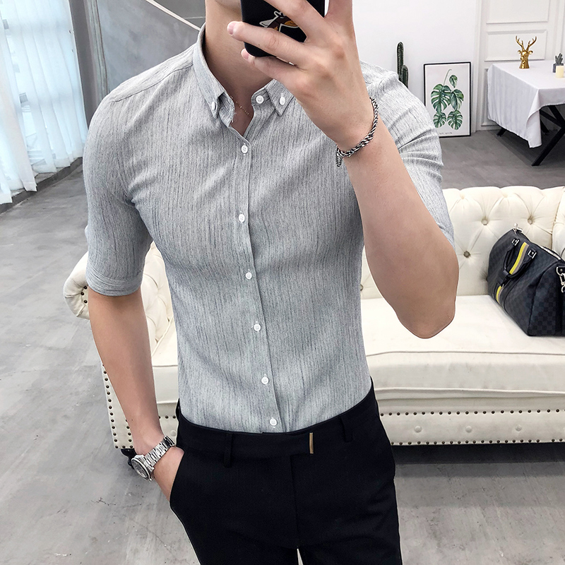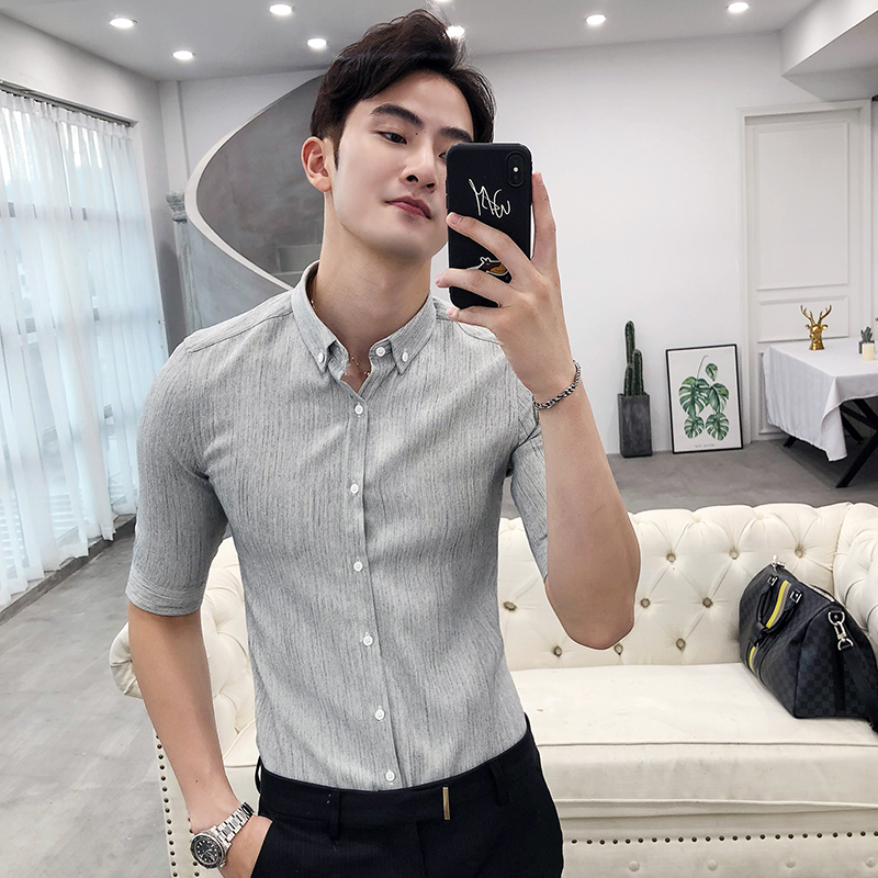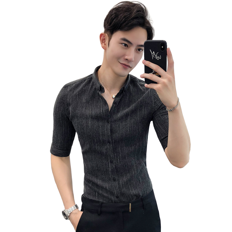 Summer short-sleeved shirt men slim casual striped cropped sleeve linen shirt premium sense hair stylist tide brand menswear