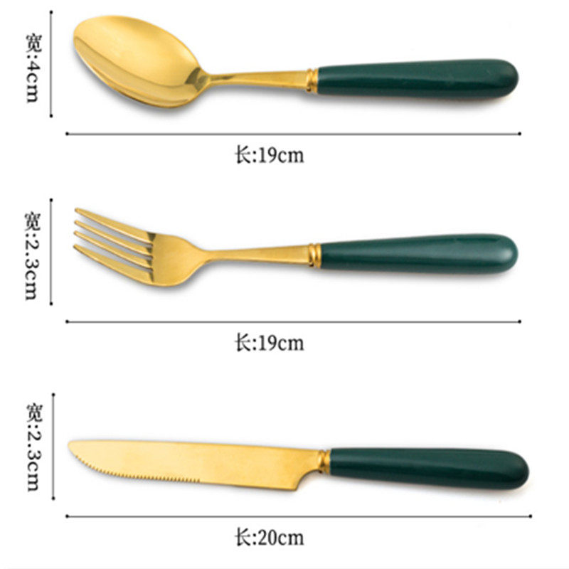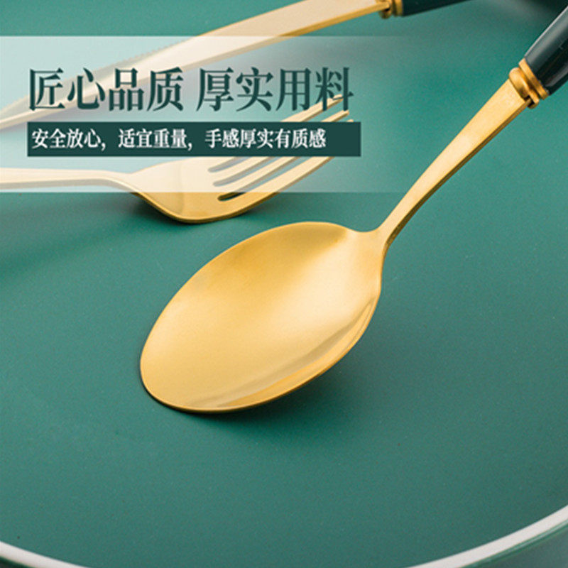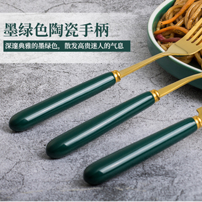 Ink green titanium alloy middle spoon one ink green titanium alloy with one ink green titanium alloy steak knife one ink green titanium alloy knife fork spoon three sets of ink green titanium alloy fruit fork an ink green titanium alloy coffee spoon one