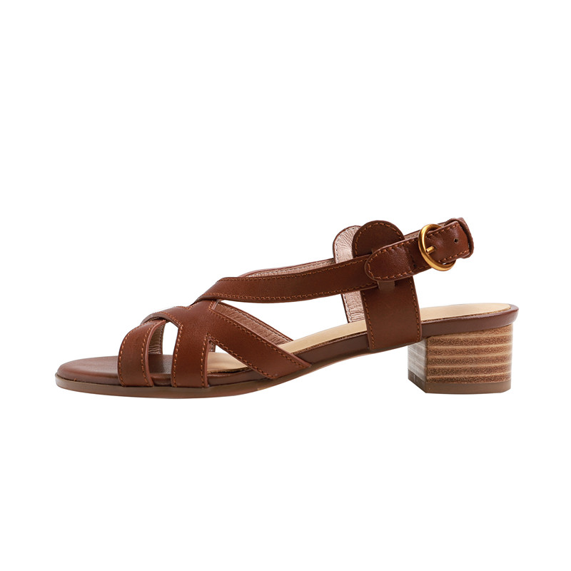 Retro thick-heeled sandals for women 2022 new summer open-toed one-word buckle leather brown medium-heeled Roman sandals for women