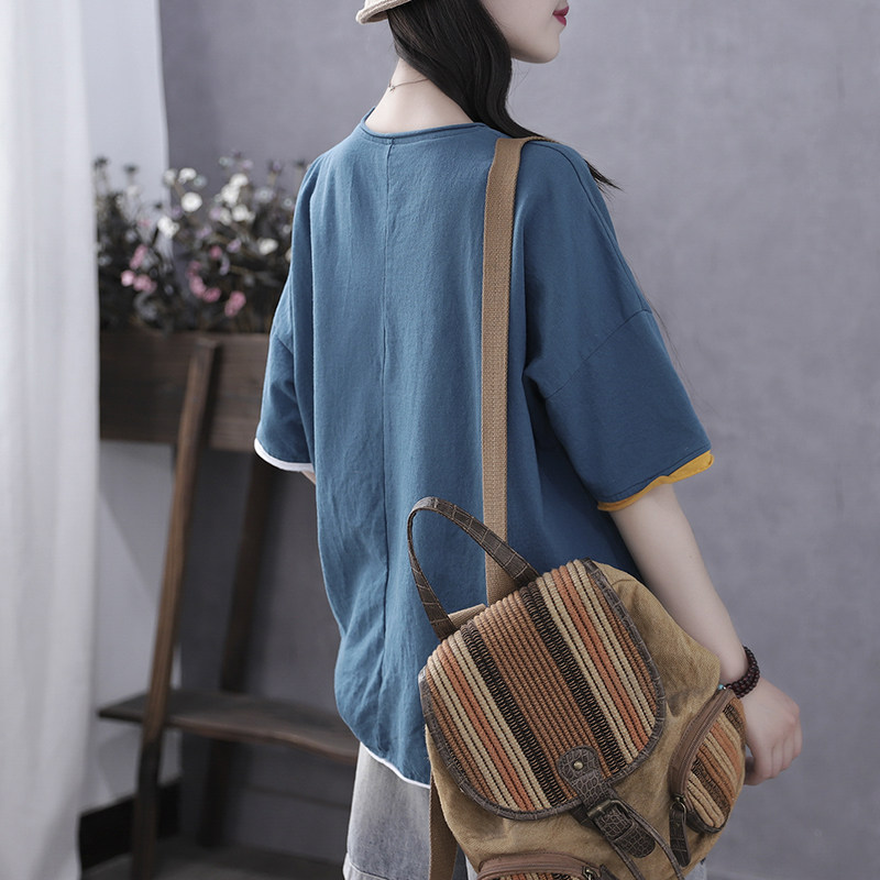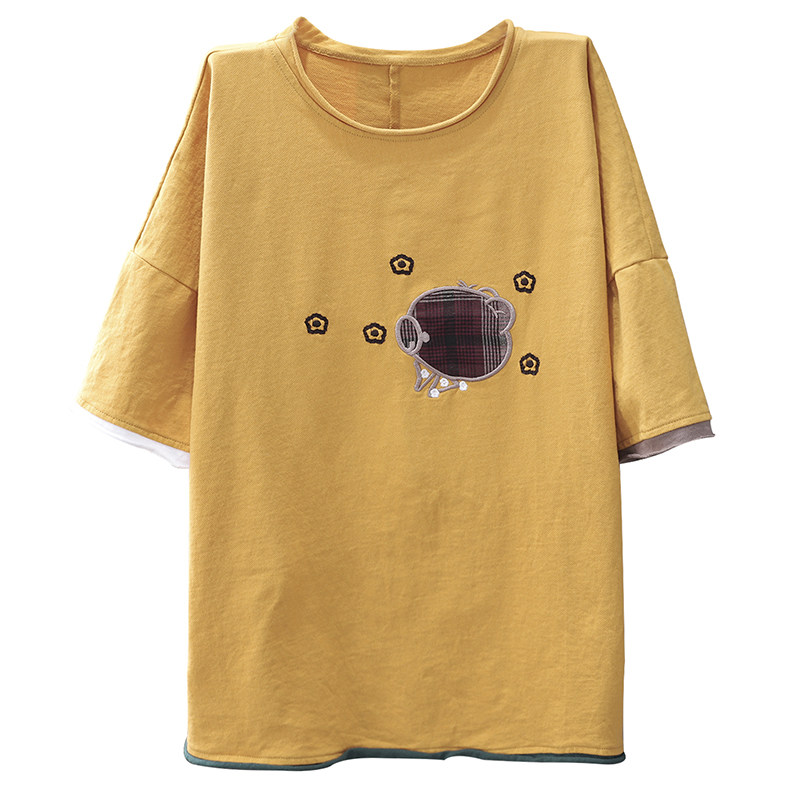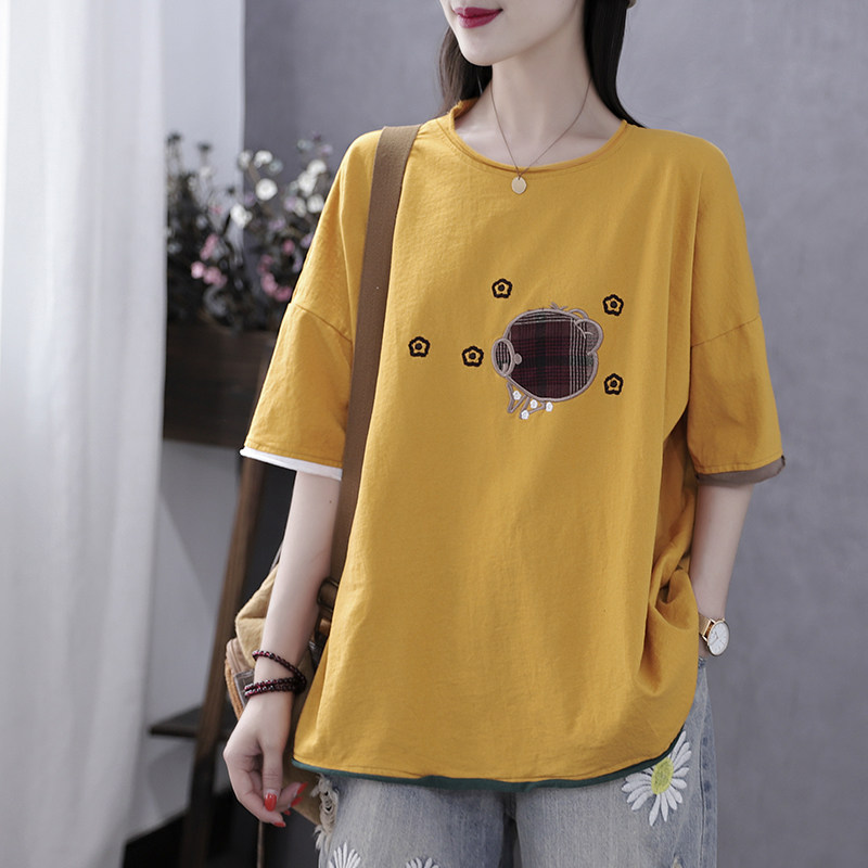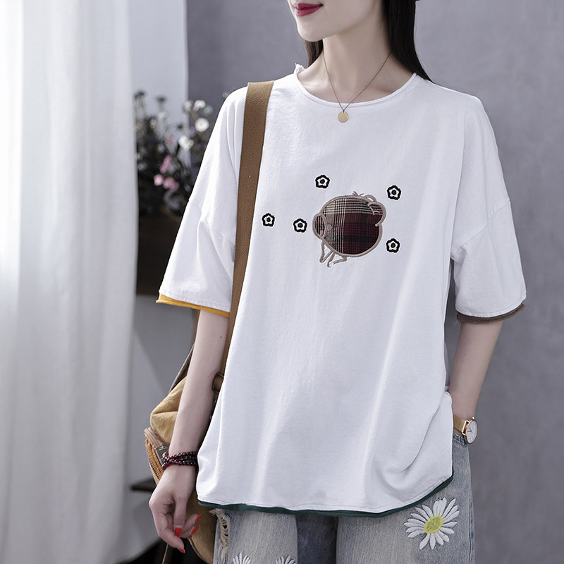 Hanso Yi's new short - sleeved T - shirt in the summer of retro - style cloth embroidered five - point sleeve tops