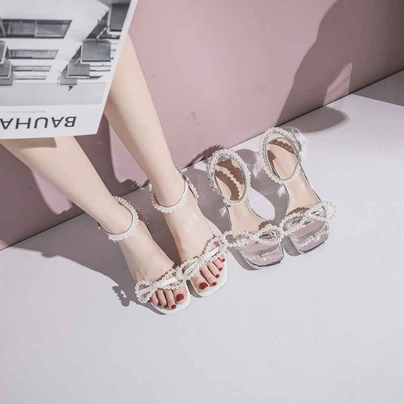 This year's new net red medium heel thick heel one-word buckle belt Roman bow pearl niche sandals female summer lady